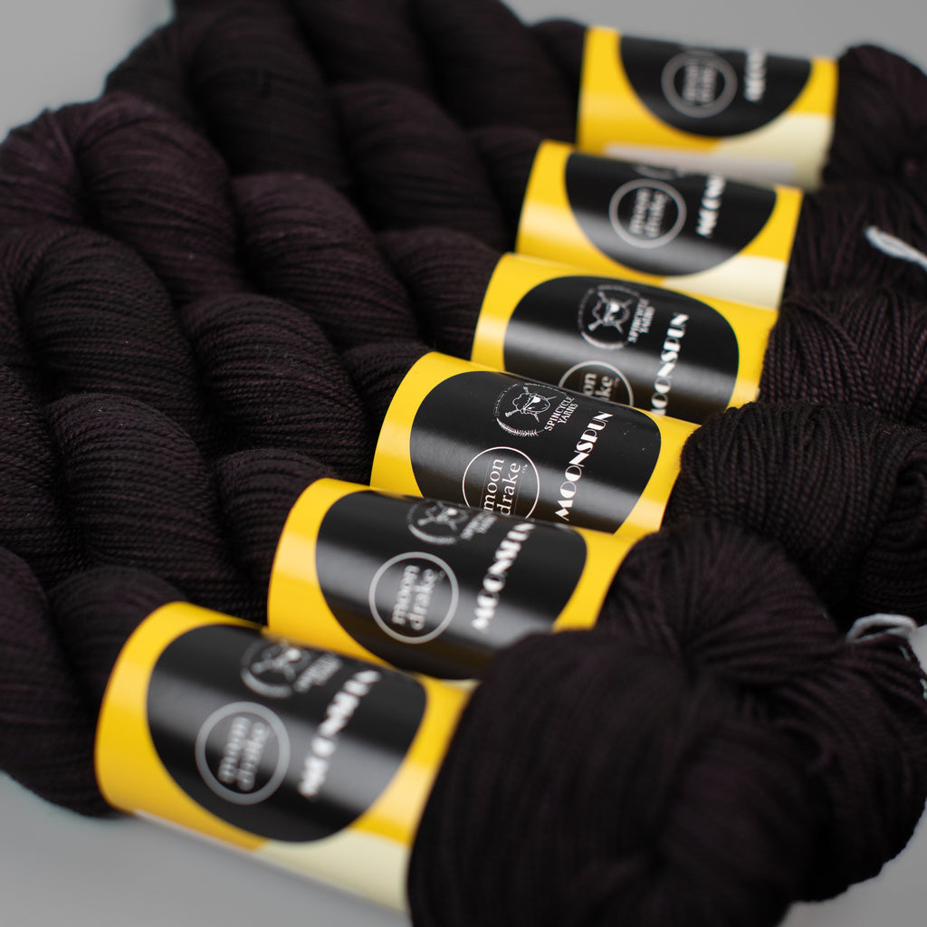 MOONSPUN • sport weight • 100% superwashed American wool • 300 yards per skein • hand wash cold, lay flat to dry • MADE IN THE USA FROM SHEEP TO SKEIN