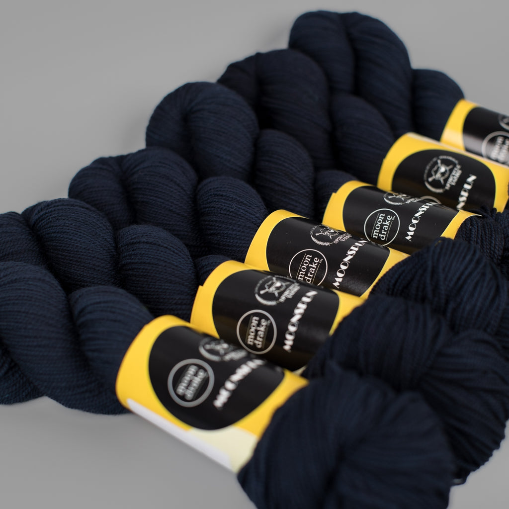 MOONSPUN • sport weight • 100% superwashed American wool • 300 yards per skein • hand wash cold, lay flat to dry • MADE IN THE USA FROM SHEEP TO SKEIN
