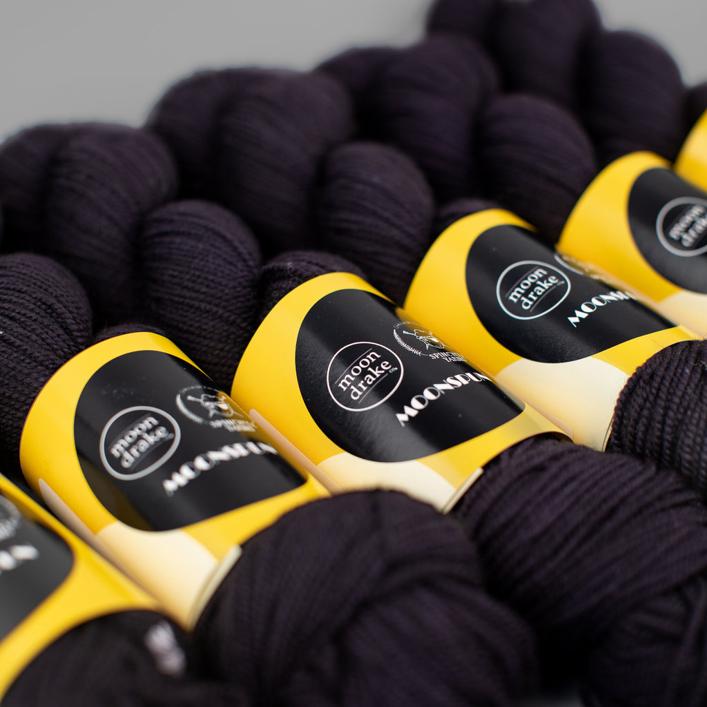MOONSPUN • sport weight • 100% superwashed American wool • 300 yards per skein • hand wash cold, lay flat to dry • MADE IN THE USA FROM SHEEP TO SKEIN