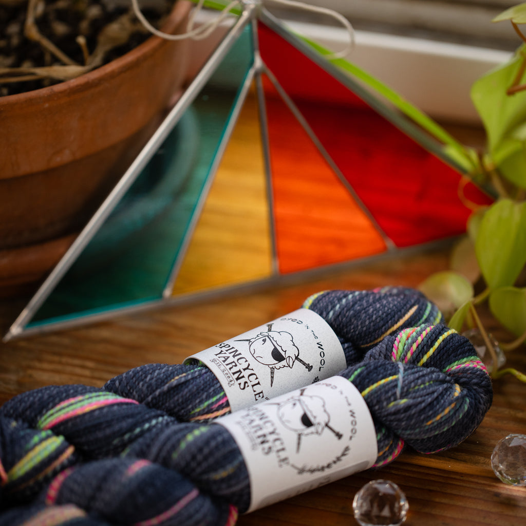 This bundle includes two skeins of the brand new Dyed in the Wool colorway Dark Side and a small triangle suncatcher.