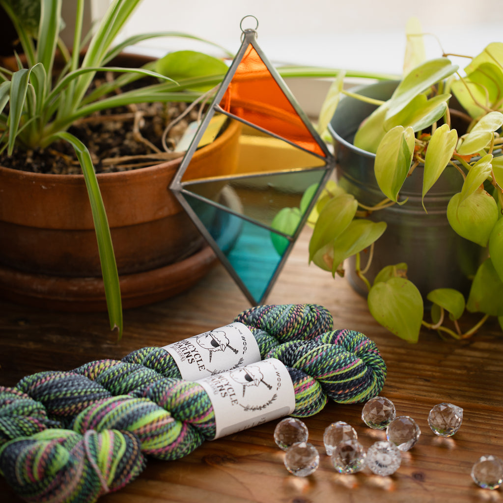 This bundle includes two skeins of the brand new Dyed in the Wool colorway Dark Side and a vertical diamond suncatcher.