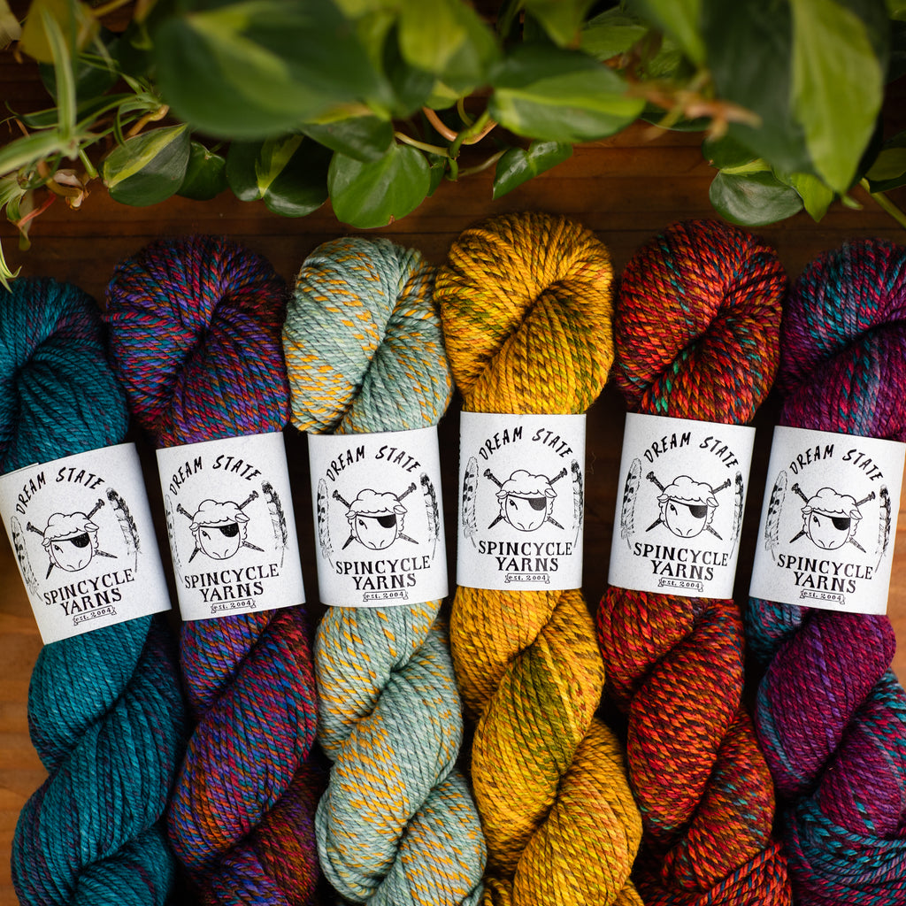 DREAM STATE • worsted weight • 100% superwashed American wool • 150 yards per skein • hand wash cold, lay flat to dry • MADE IN THE USA FROM SHEEP TO SKEIN