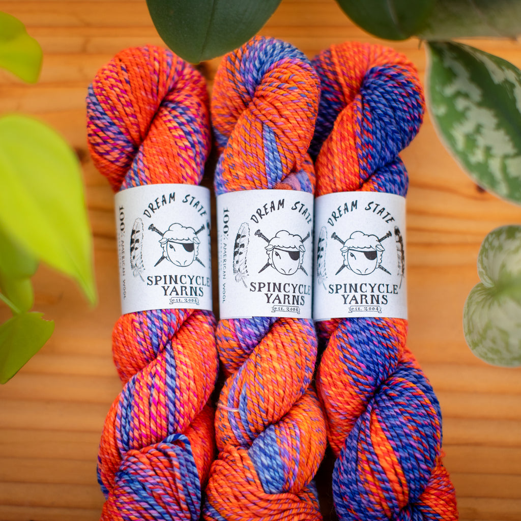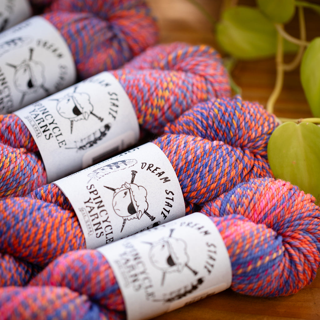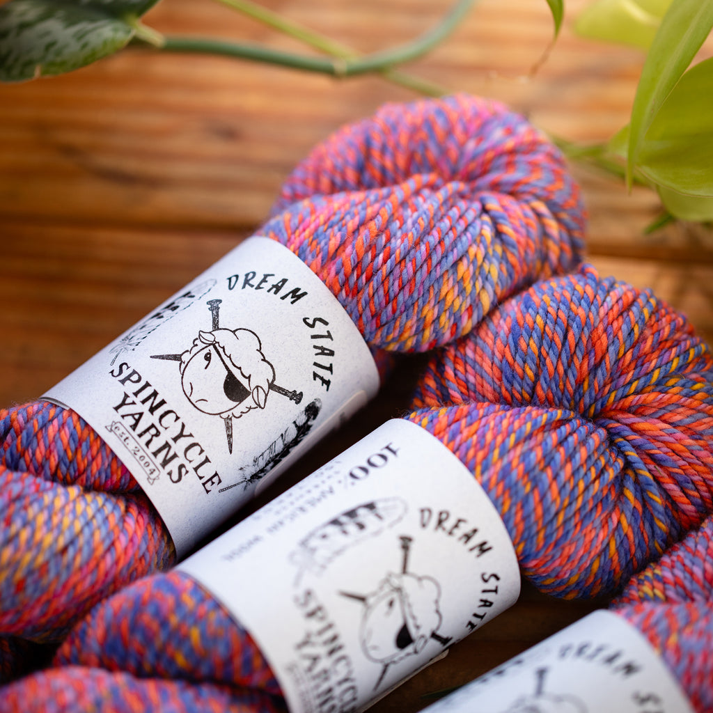 DREAM STATE • worsted weight • 100% superwashed American wool • 150 yards per skein • hand wash cold, lay flat to dry • MADE IN THE USA FROM SHEEP TO SKEIN