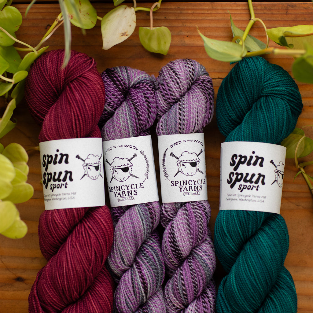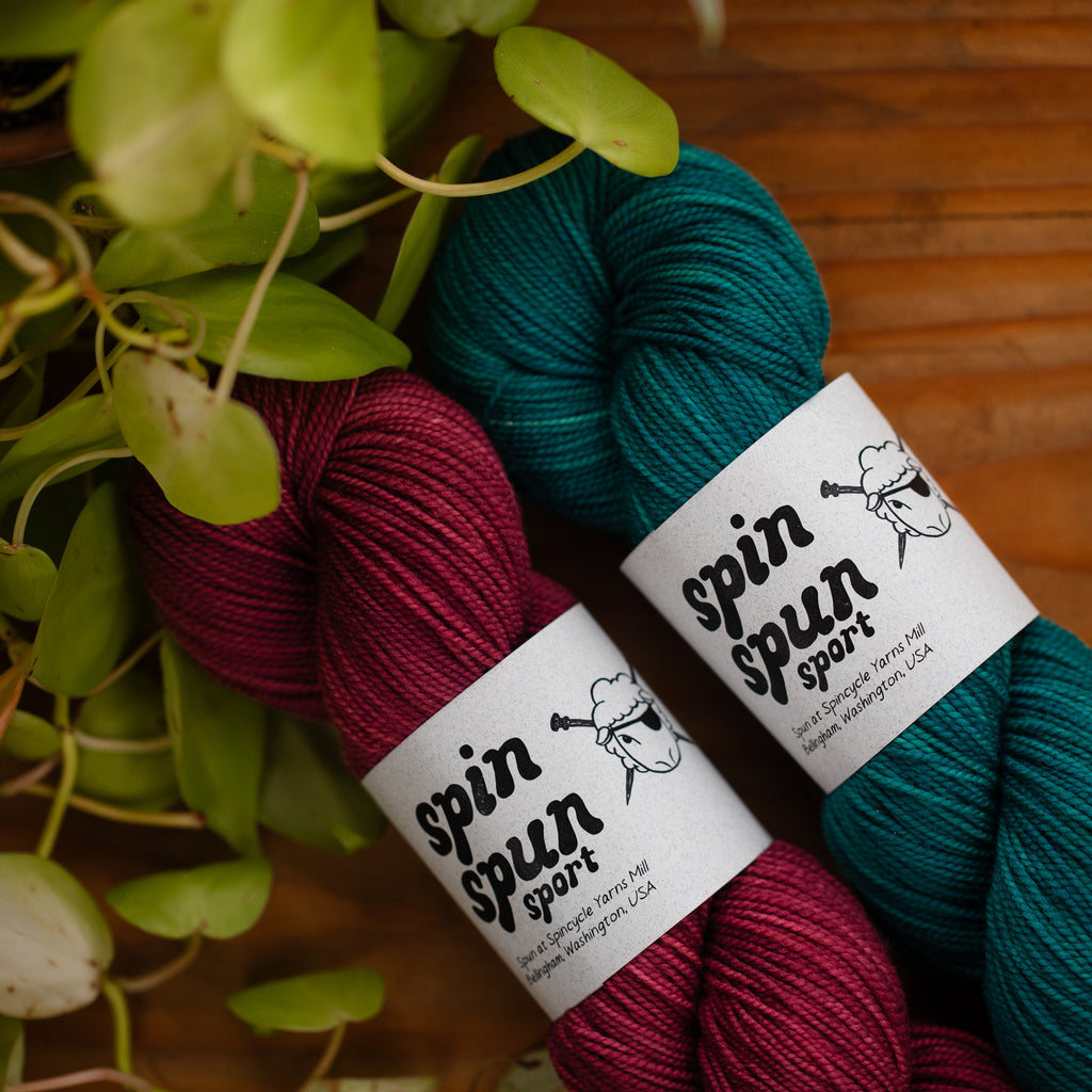 SPIN SPUN • sport weight • 100% superwashed American wool • 400 yards per skein • hand wash cold, lay flat to dry • MADE IN THE USA • SPUN IN WA
