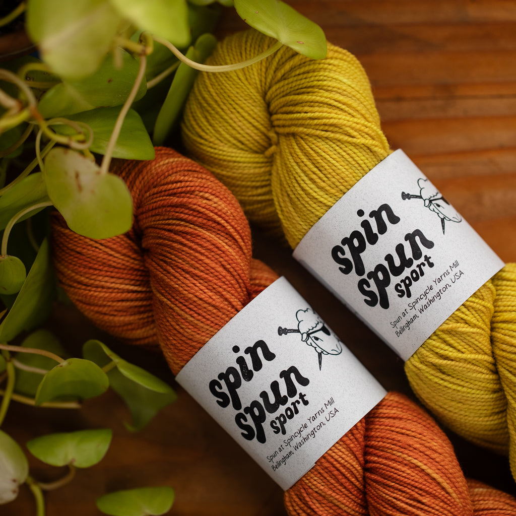 SPIN SPUN • sport weight • 100% superwashed American wool • 400 yards per skein • hand wash cold, lay flat to dry • MADE IN THE USA • SPUN IN WA