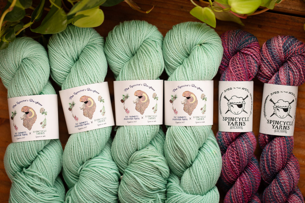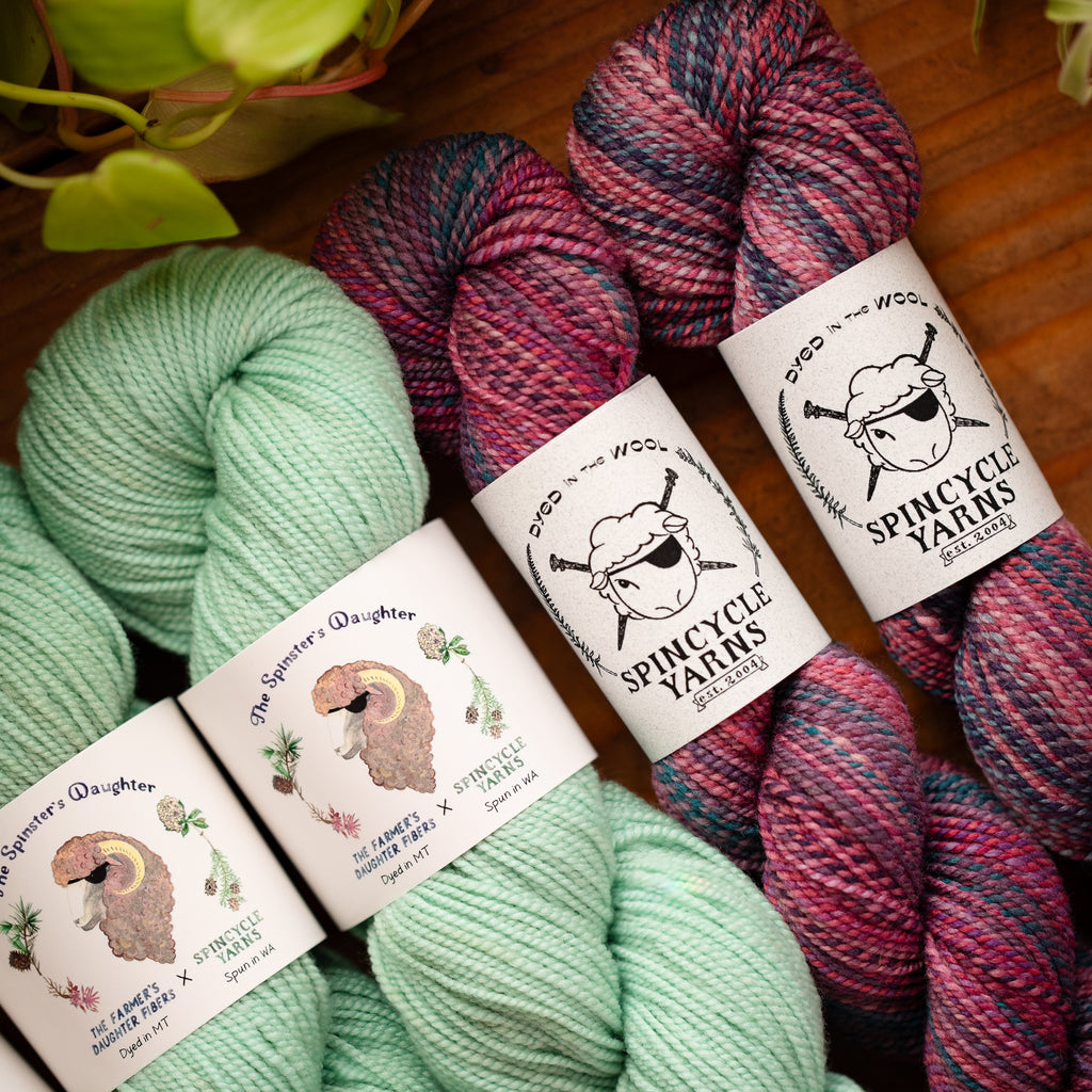 SPINSTER'S DAUGHTER SPORT • sport weight • 100% superwashed American wool • 300 yards per skein • hand wash cold, lay flat to dry • MADE IN THE USA • SPUN IN WA • DYED IN MT