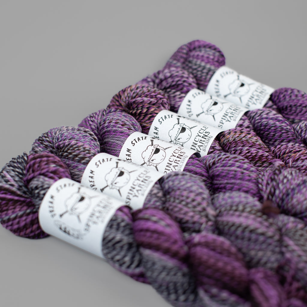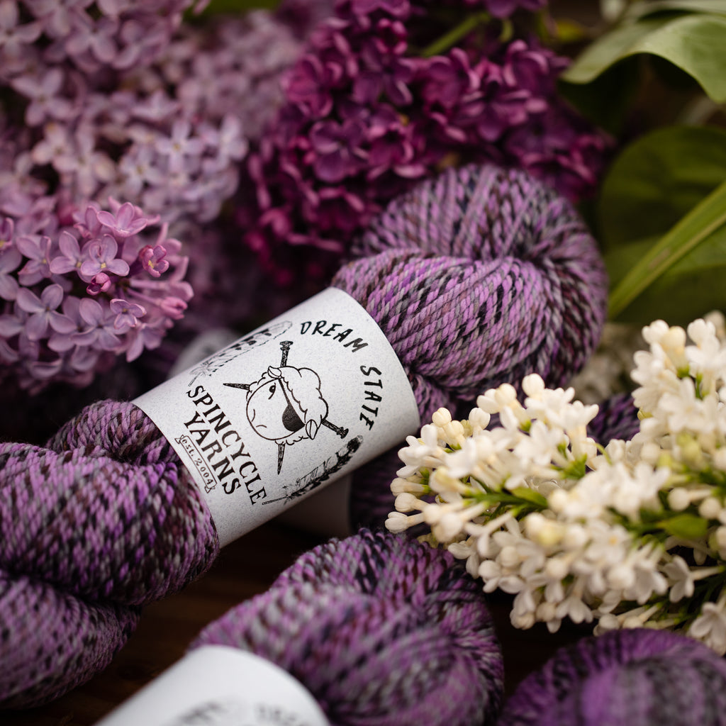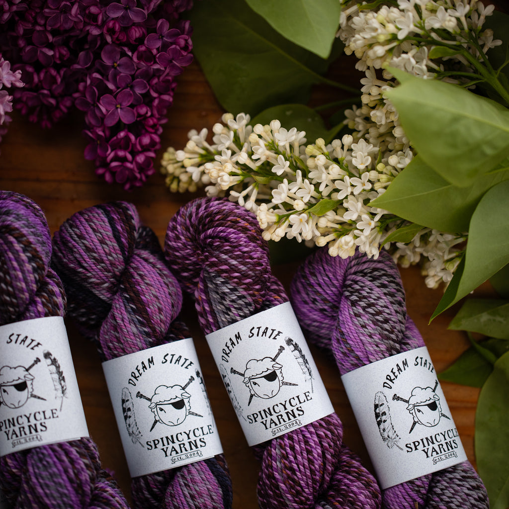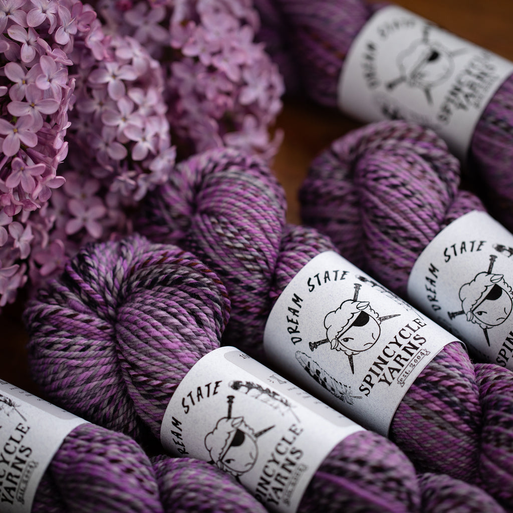 DREAM STATE • worsted weight • 100% superwashed American wool • 150 yards per skein • hand wash cold, lay flat to dry • GROWN IN THE USA • DYED & SPUN IN WASHINGTON