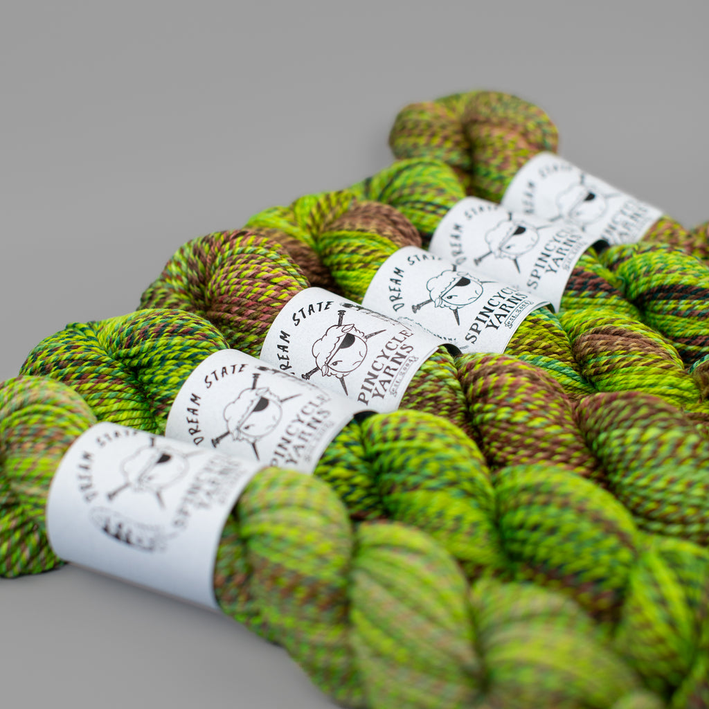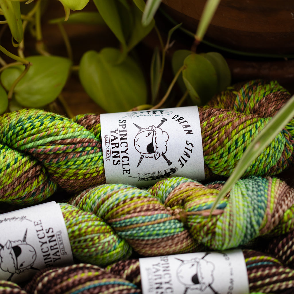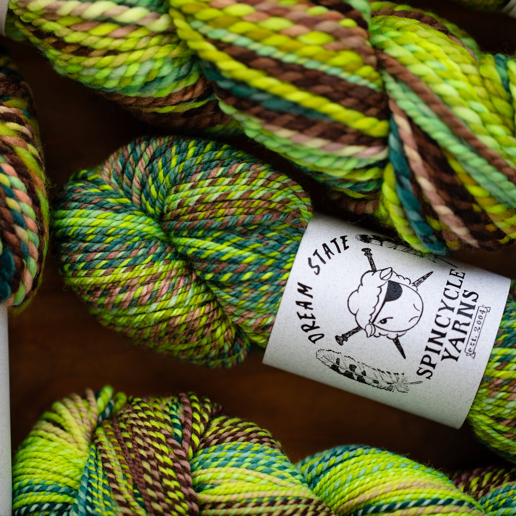 DREAM STATE • worsted weight • 100% superwashed American wool • 150 yards per skein • hand wash cold, lay flat to dry • GROWN IN THE USA • DYED & SPUN IN WASHINGTON