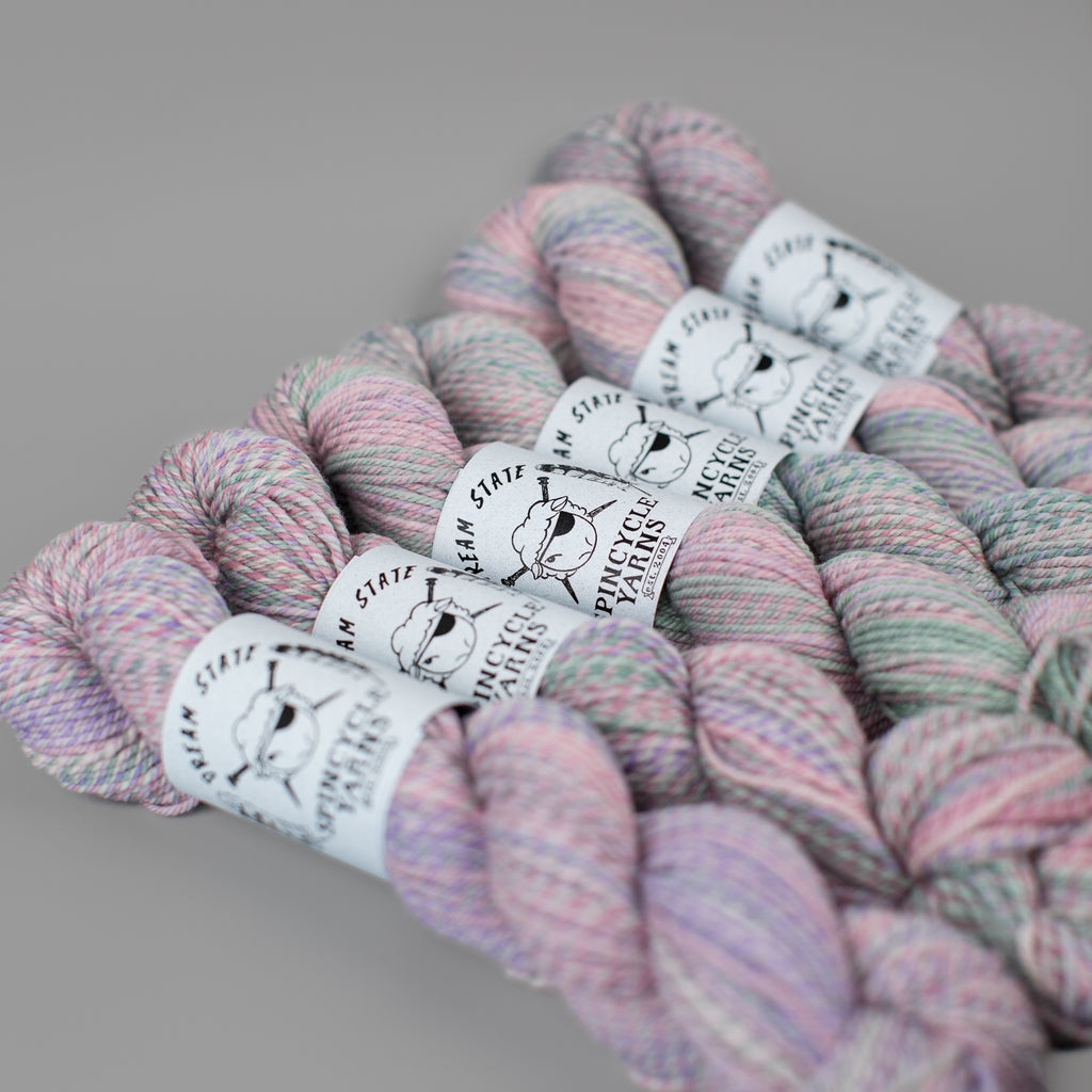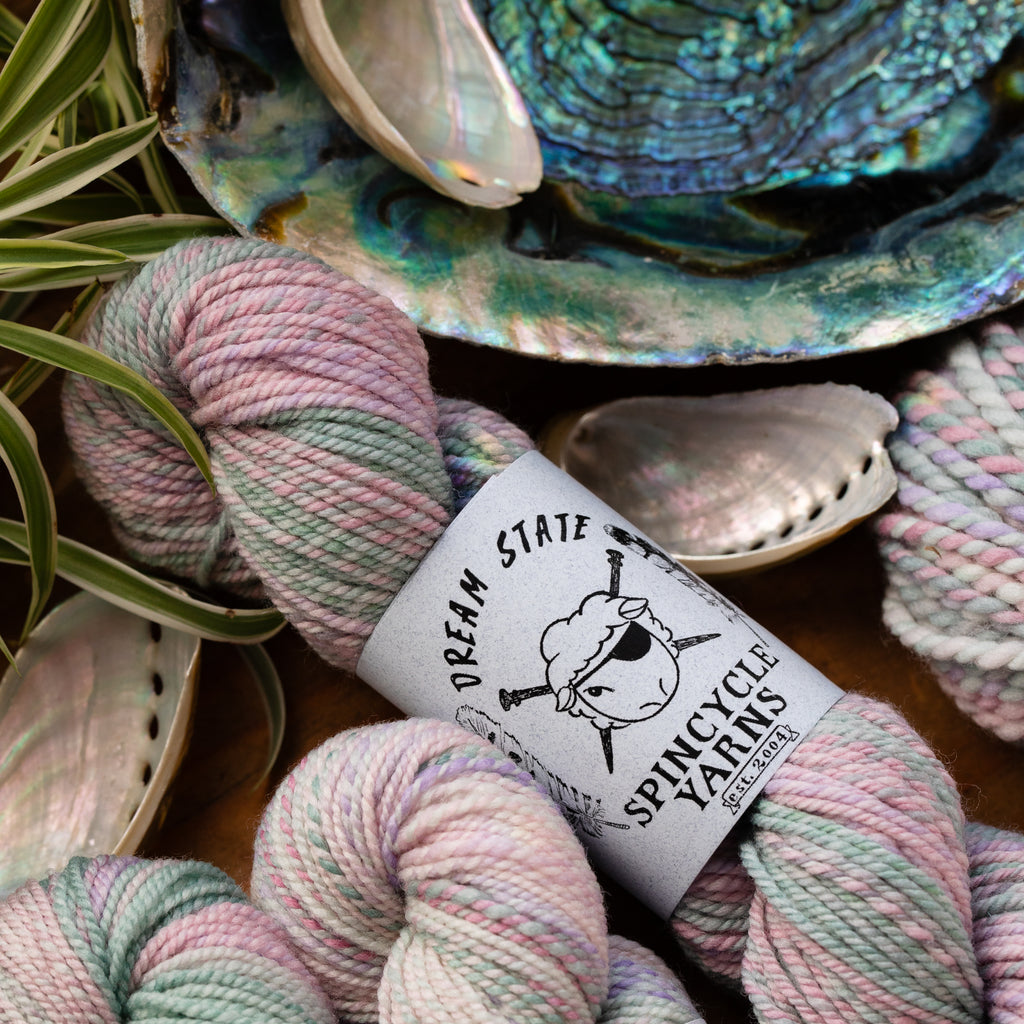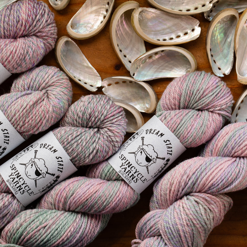 DREAM STATE • worsted weight • 100% superwashed American wool • 150 yards per skein • hand wash cold, lay flat to dry • GROWN IN THE USA • DYED & SPUN IN WASHINGTON
