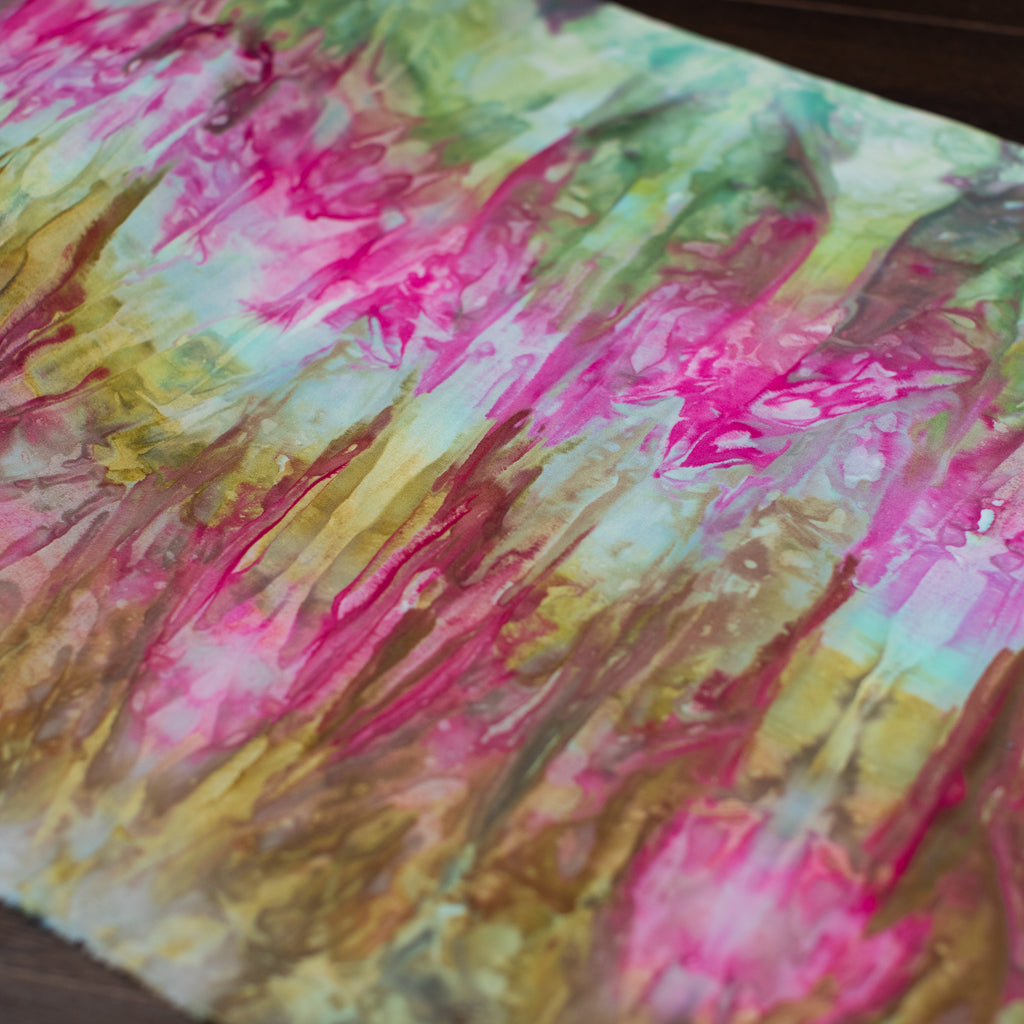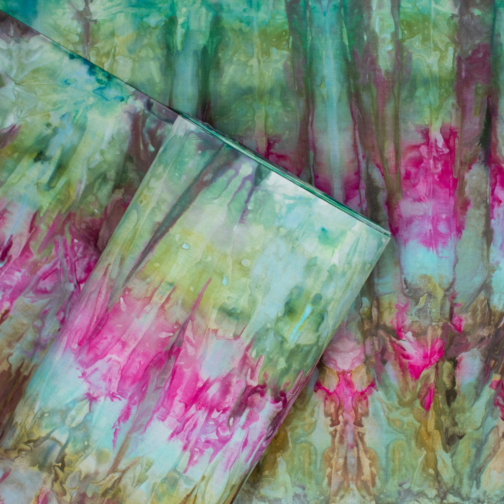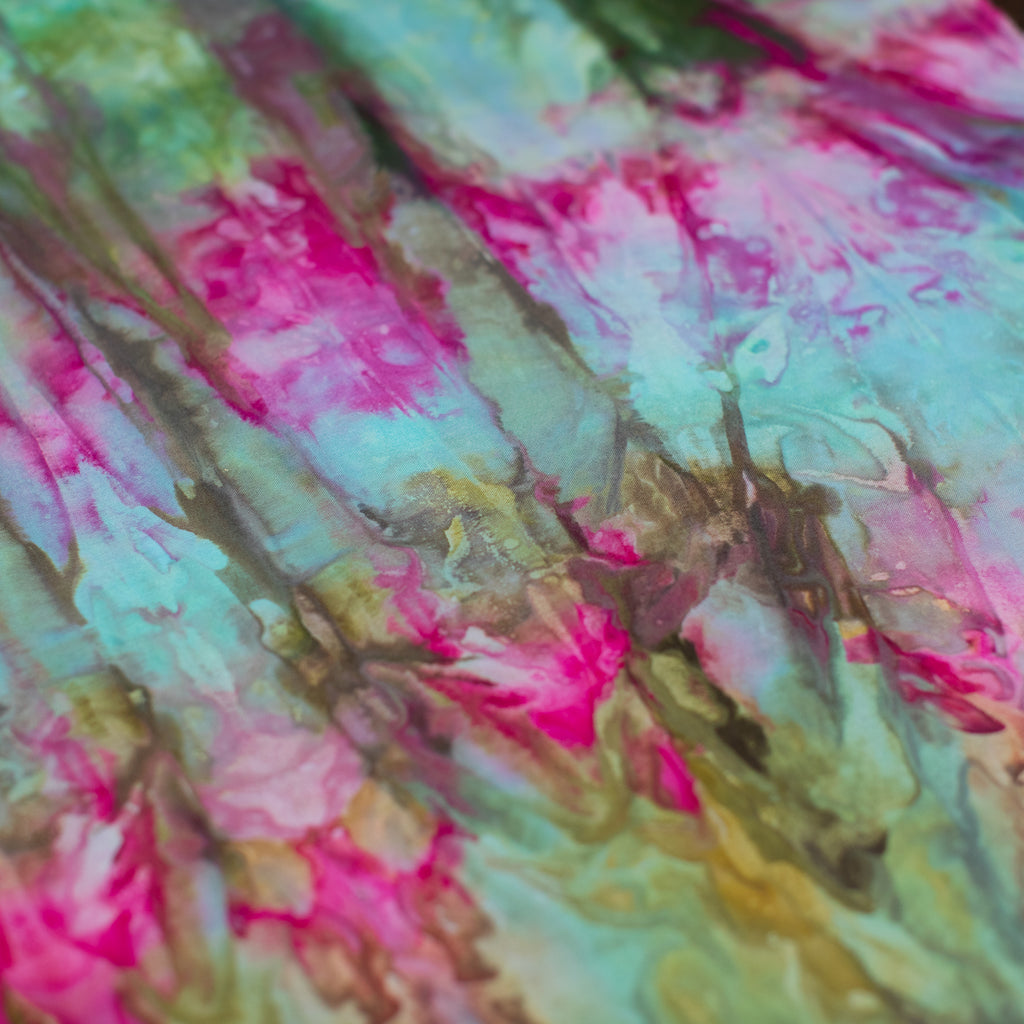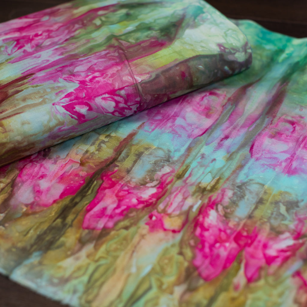 Similarly to our yarn, you will receive a cut of fabric from this bolt, but not the exact pictured. Each inch of fabric we ice dye is unique! We recommend buying your entire yardage requirement for your project all at once, as the fabric is one of a kind.