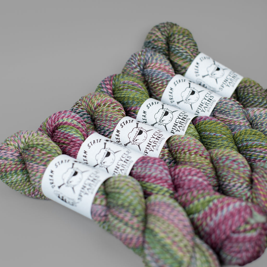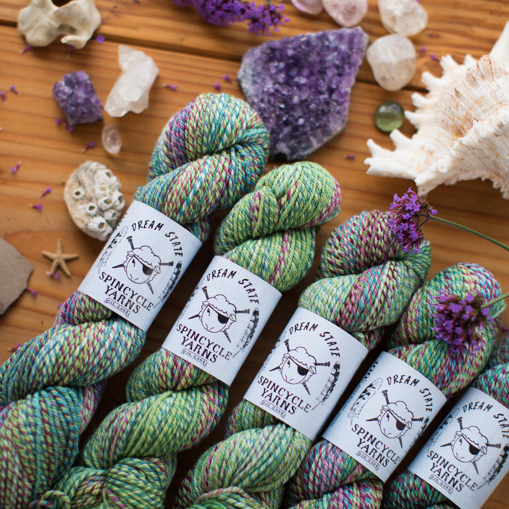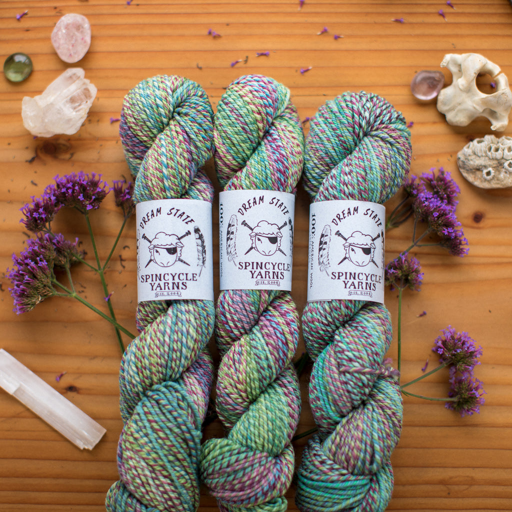 DREAM STATE • worsted weight • 100% superwashed American wool • 150 yards per skein • hand wash cold, lay flat to dry • GROWN IN THE USA • DYED & SPUN IN WASHINGTON