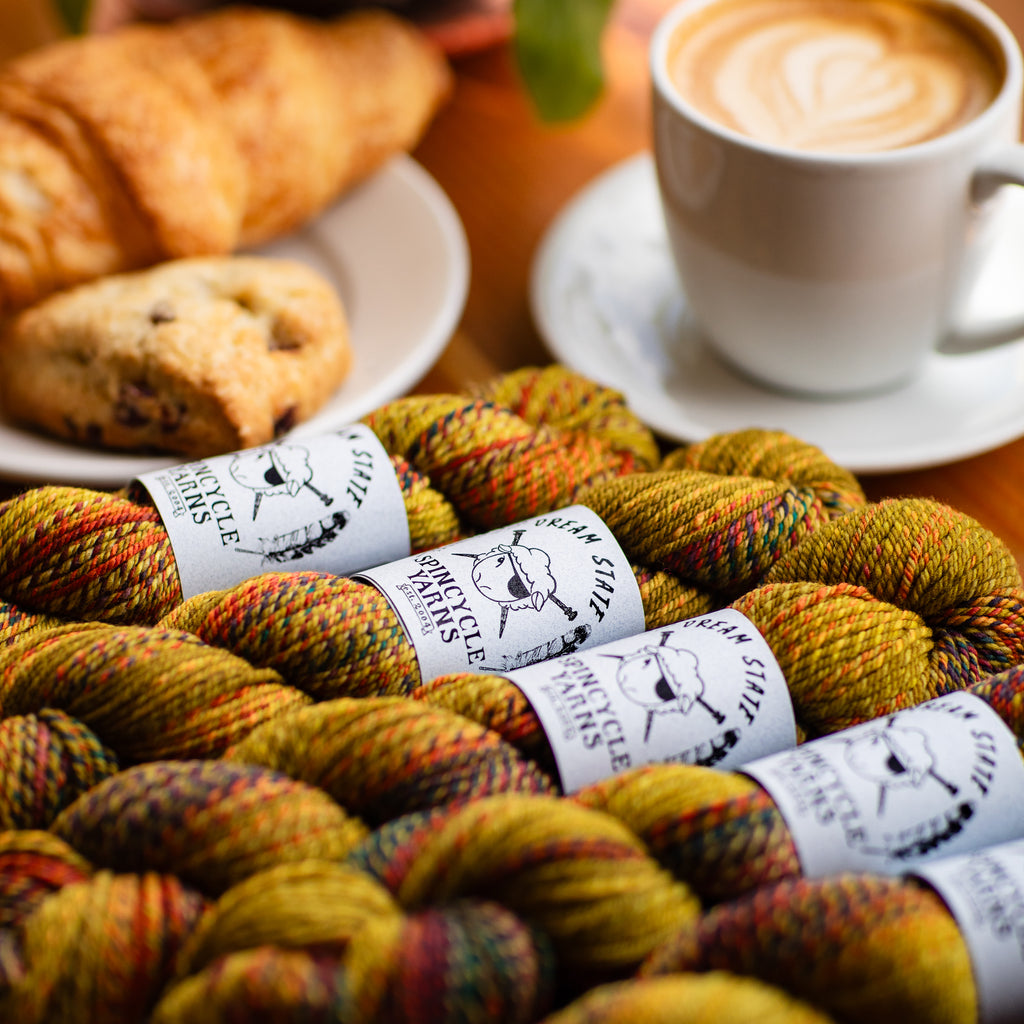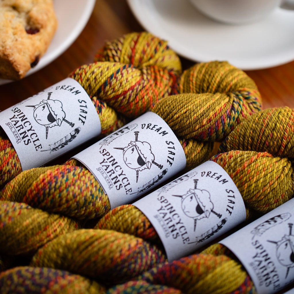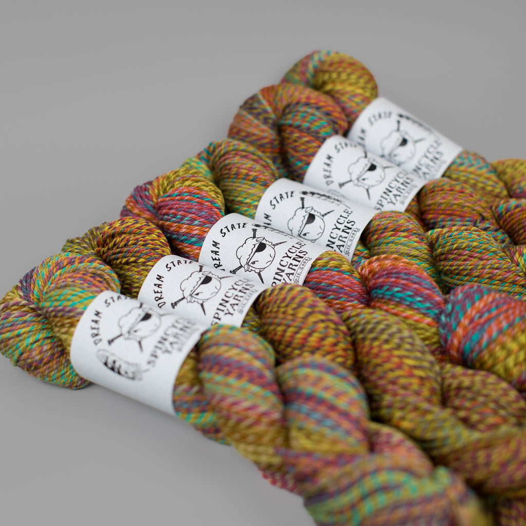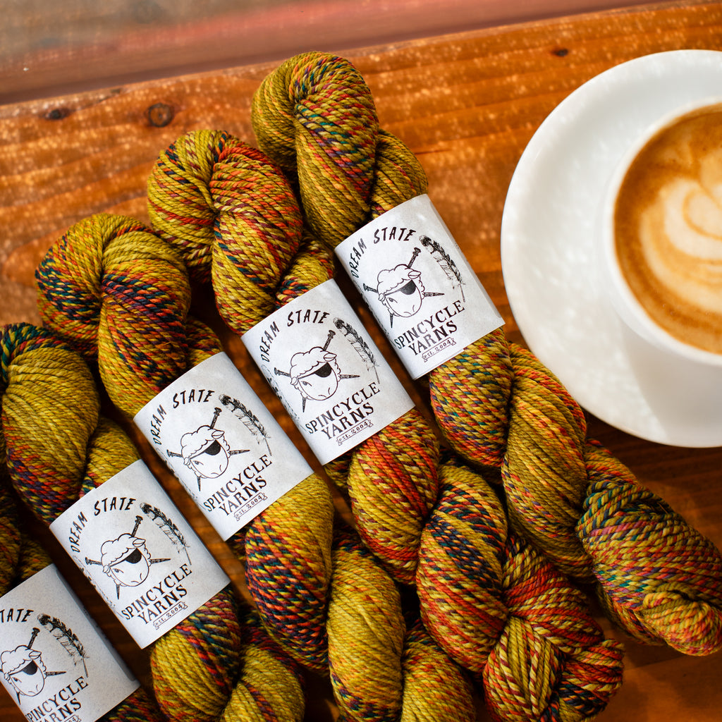 DREAM STATE • worsted weight • 100% superwashed American wool • 150 yards per skein • hand wash cold, lay flat to dry • GROWN IN THE USA • DYED & SPUN IN WASHINGTON