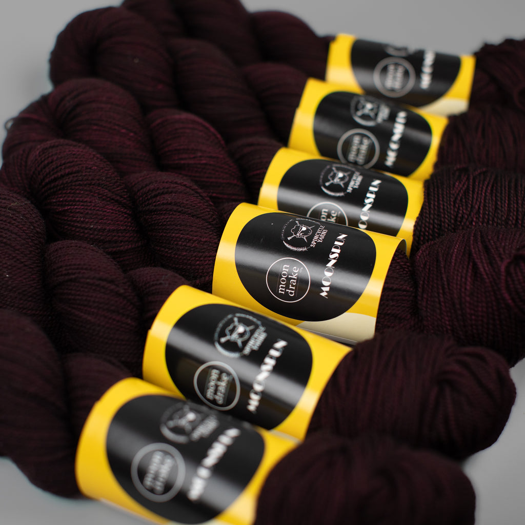 MOONSPUN • sport weight • 100% superwashed American wool • 300 yards per skein • hand wash cold, lay flat to dry • MADE IN THE USA FROM SHEEP TO SKEIN