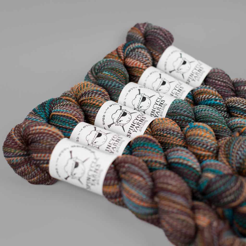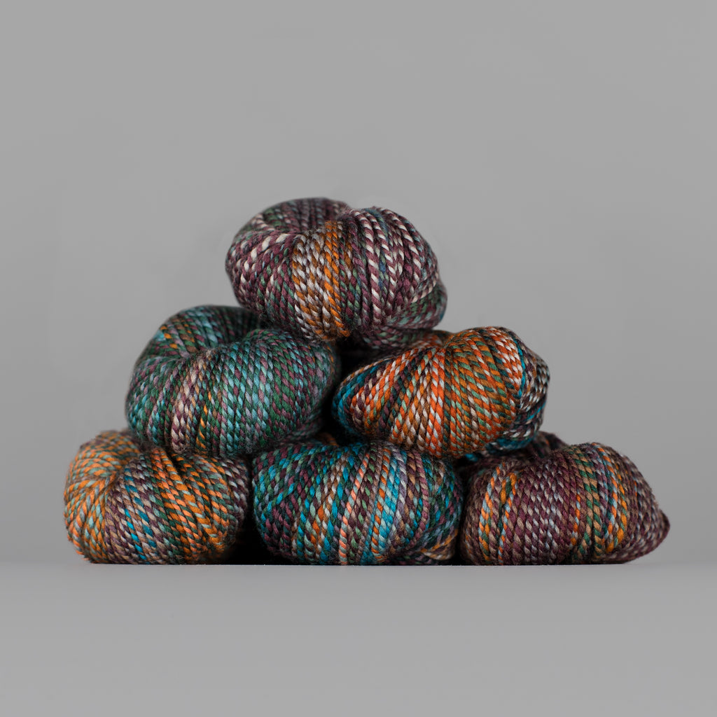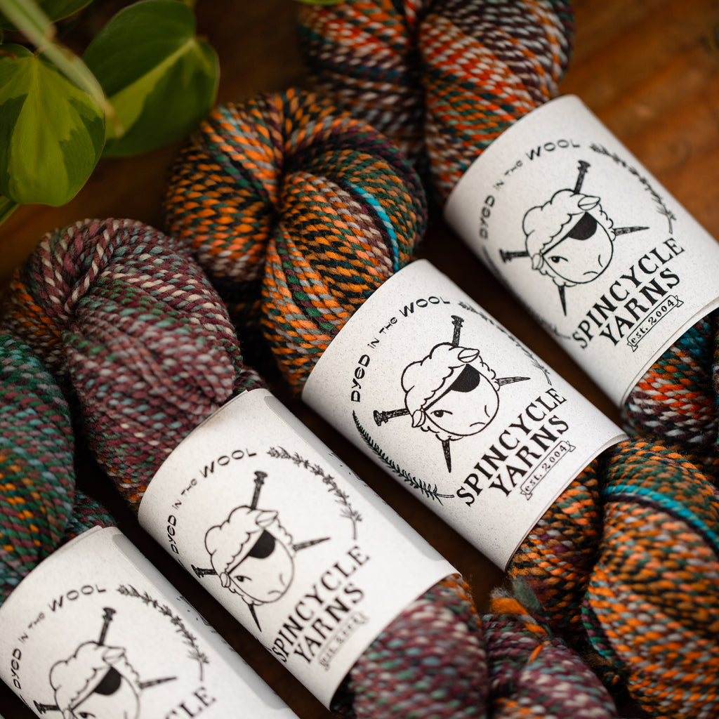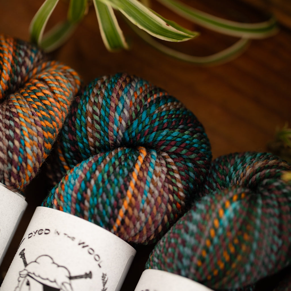 Here at the mill, we sometimes ply different colorways together to clear off bobbins with leftover yardage! When a skein or two of Wololo x Something Wicked came through, we were all INTO IT.