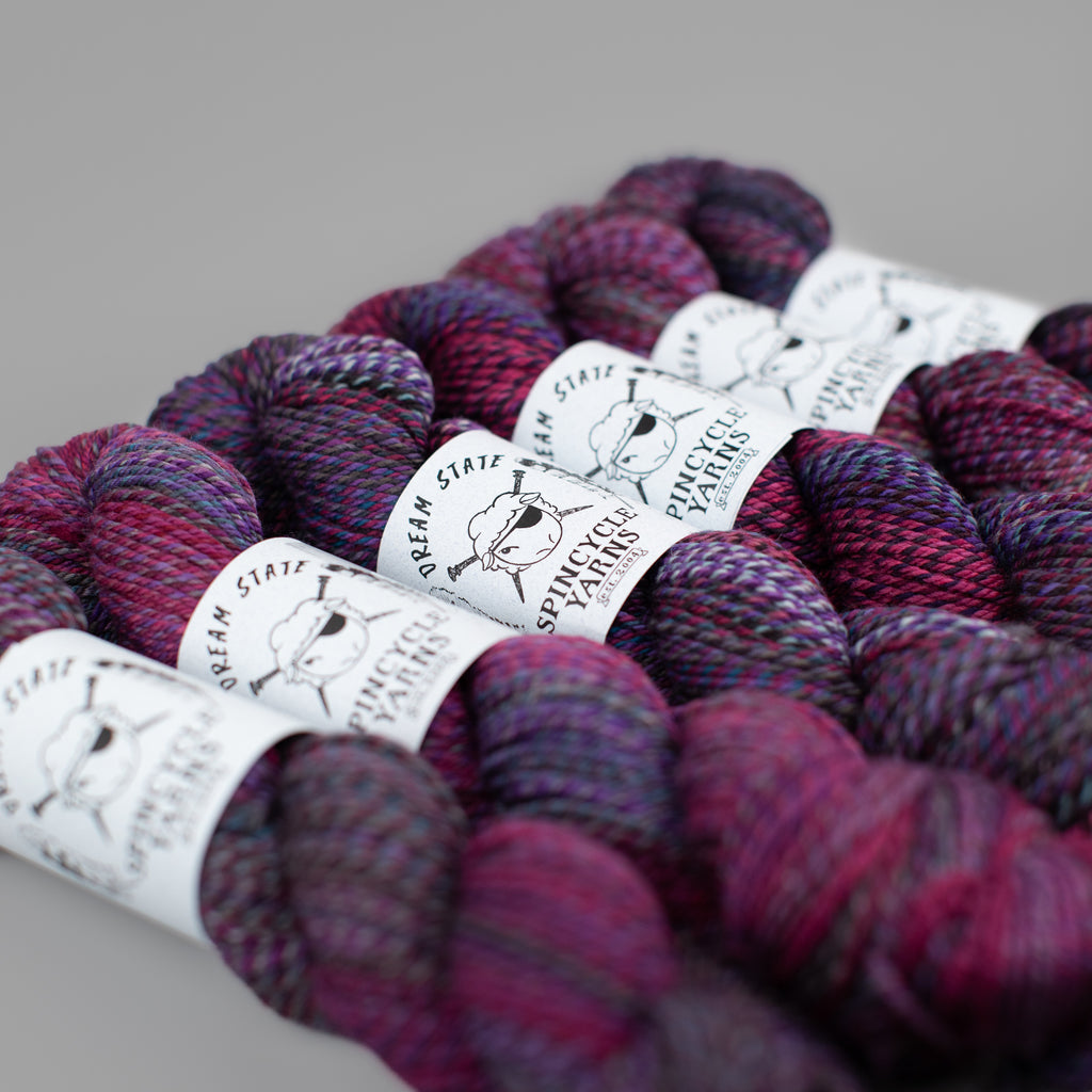 DREAM STATE • worsted weight • 100% superwashed American wool • 150 yards per skein • hand wash cold, lay flat to dry • GROWN IN THE USA • DYED & SPUN IN WASHINGTON