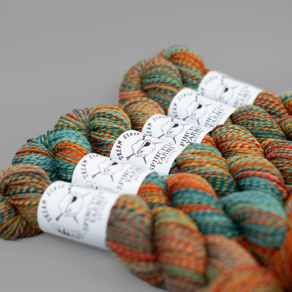 DREAM STATE • worsted weight • 100% superwashed American wool • 150 yards per skein • hand wash cold, lay flat to dry • GROWN IN THE USA • DYED & SPUN IN WASHINGTON