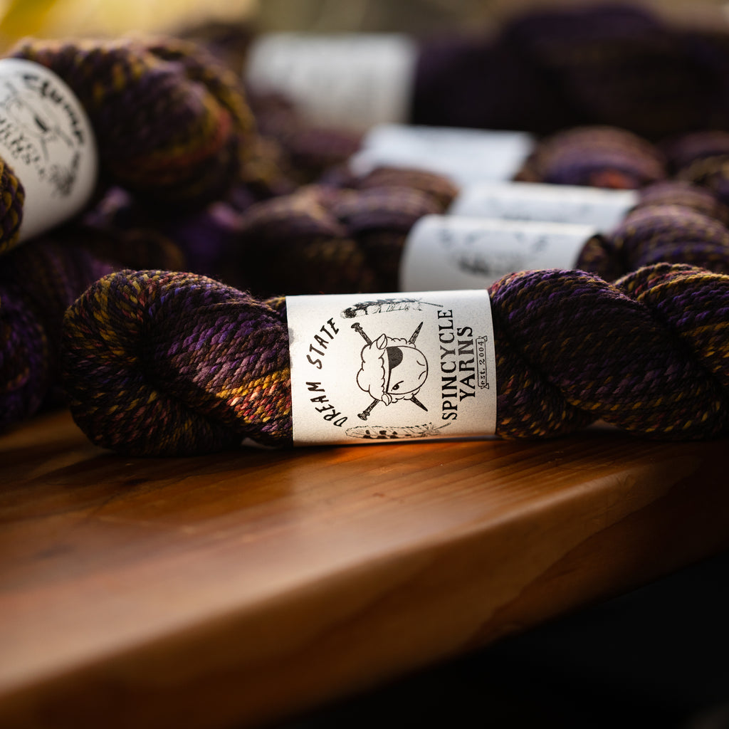 DREAM STATE • worsted weight • 100% superwashed American wool • 150 yards per skein • hand wash cold, lay flat to dry • GROWN IN THE USA • DYED & SPUN IN WASHINGTON