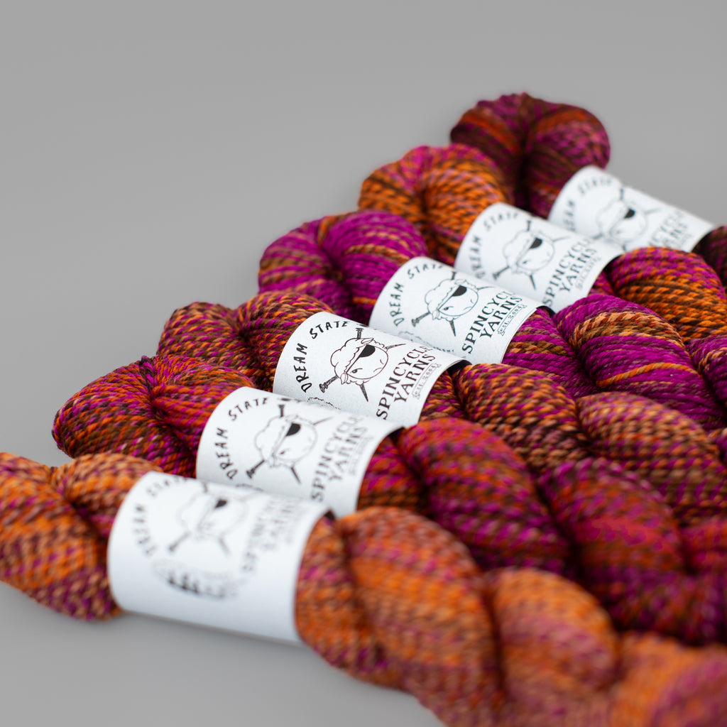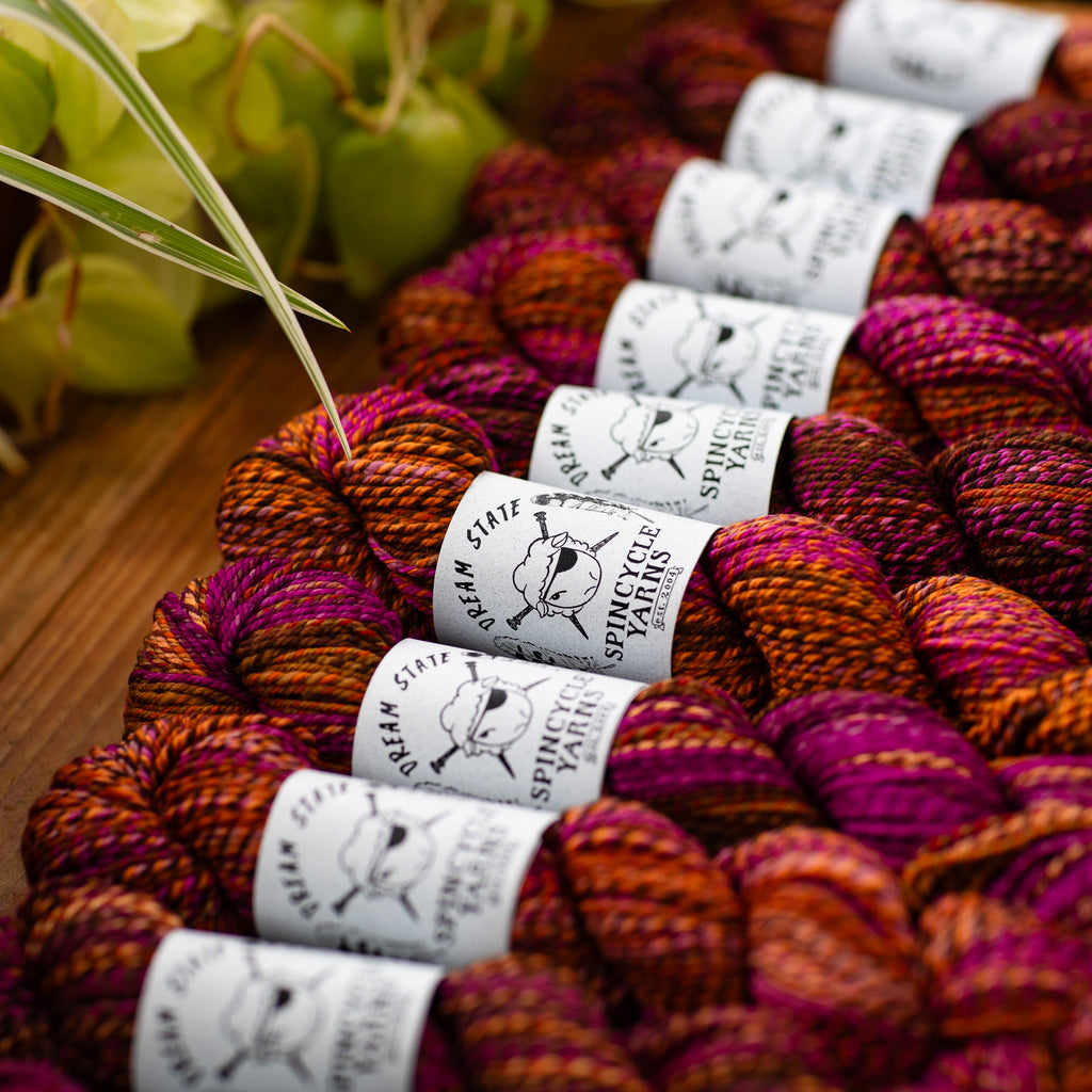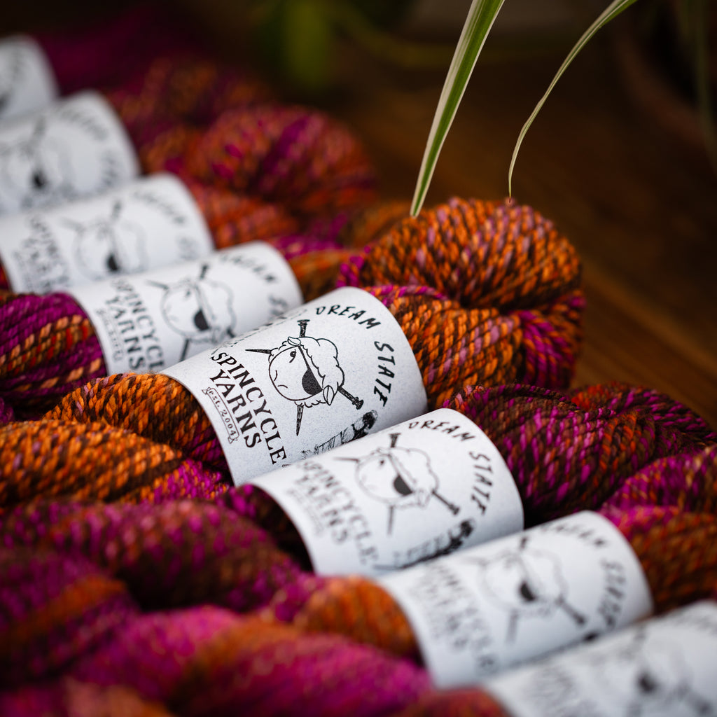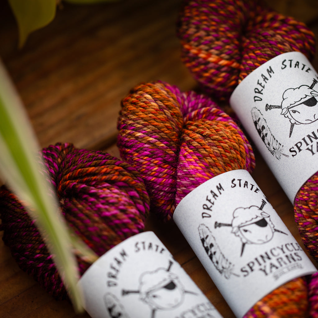 DREAM STATE • worsted weight • 100% superwashed American wool • 150 yards per skein • hand wash cold, lay flat to dry • GROWN IN THE USA • DYED & SPUN IN WASHINGTON