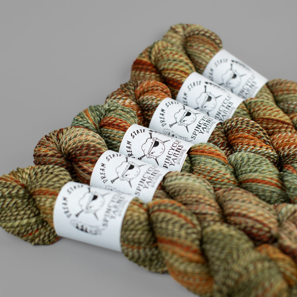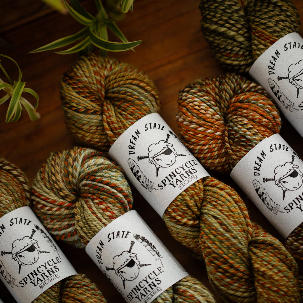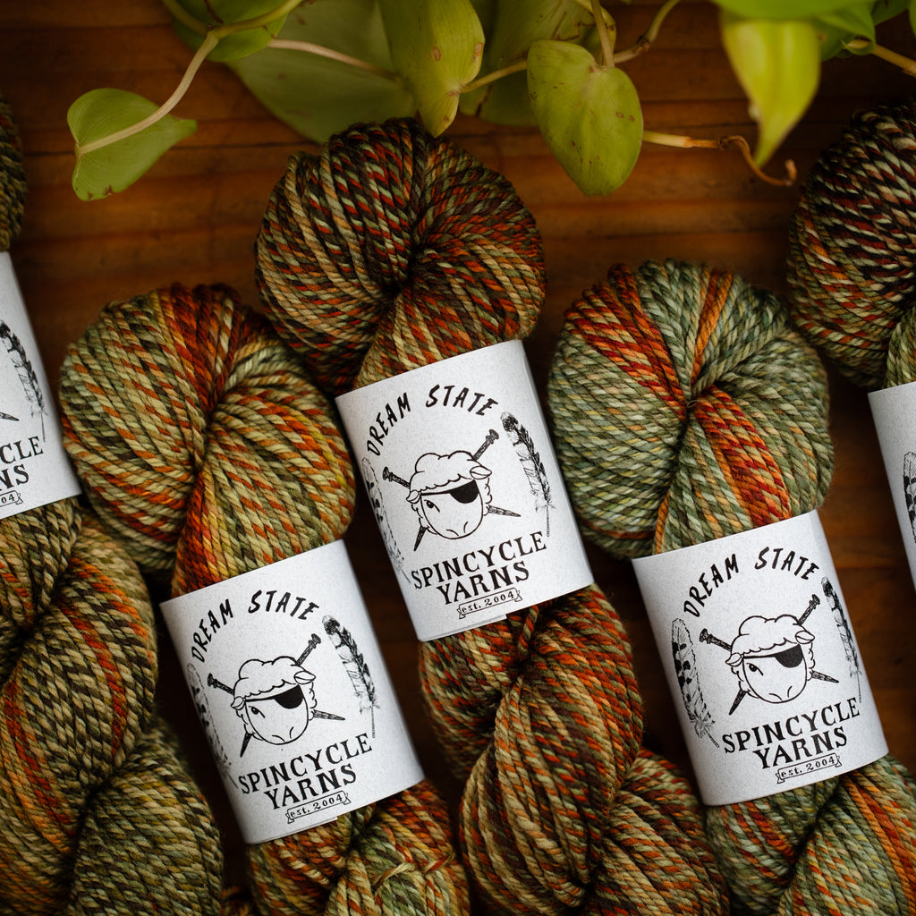 DREAM STATE • worsted weight • 100% superwashed American wool • 150 yards per skein • hand wash cold, lay flat to dry • GROWN IN THE USA • DYED & SPUN IN WASHINGTON