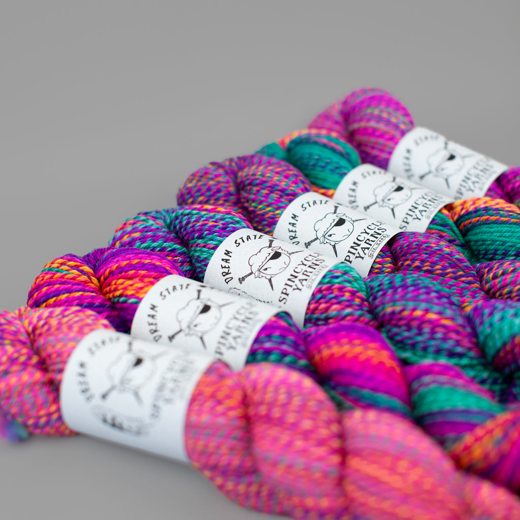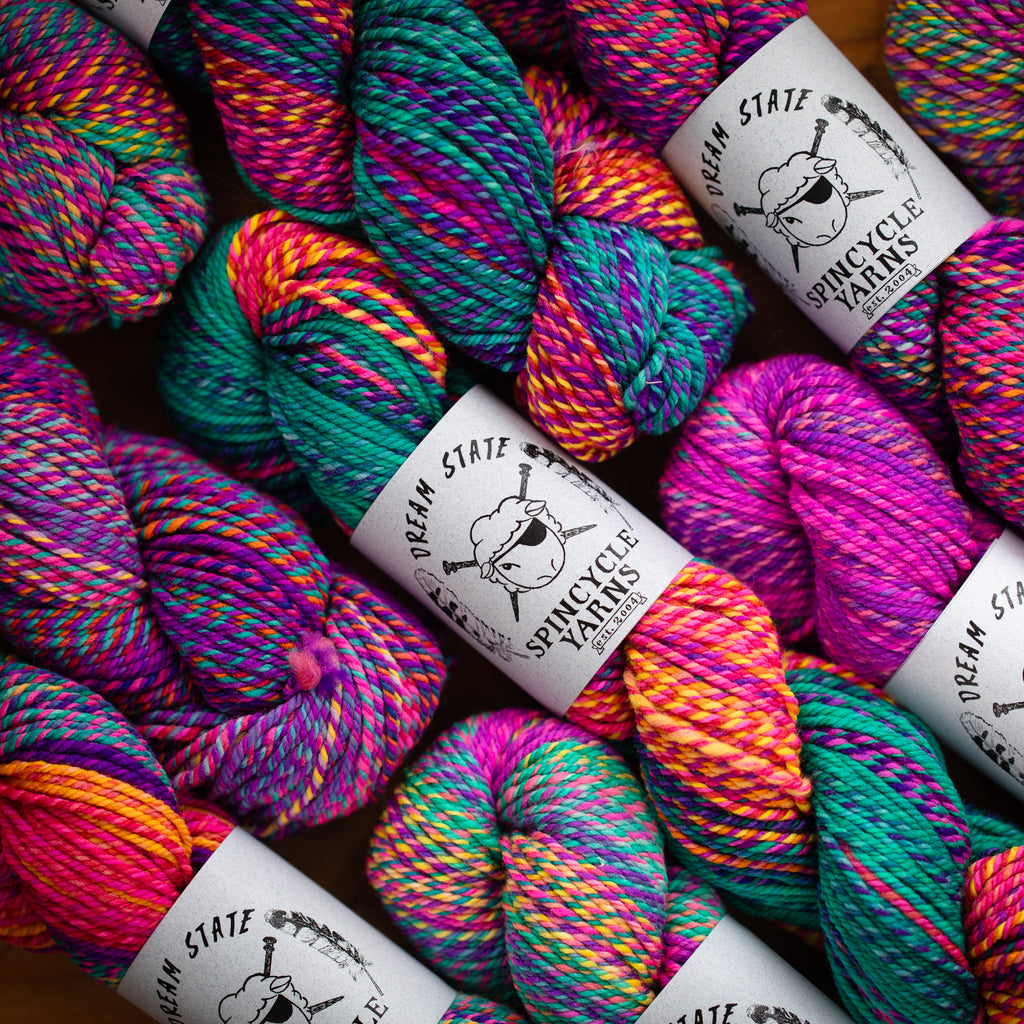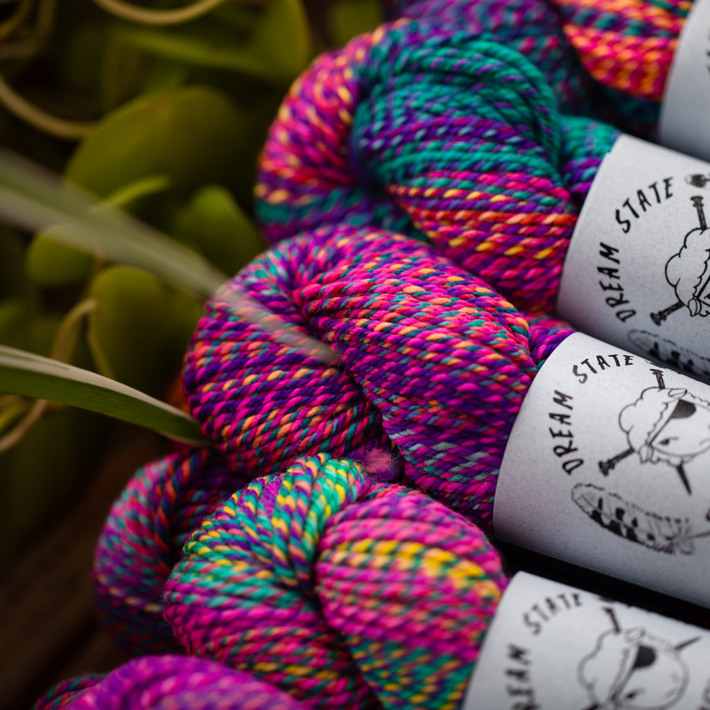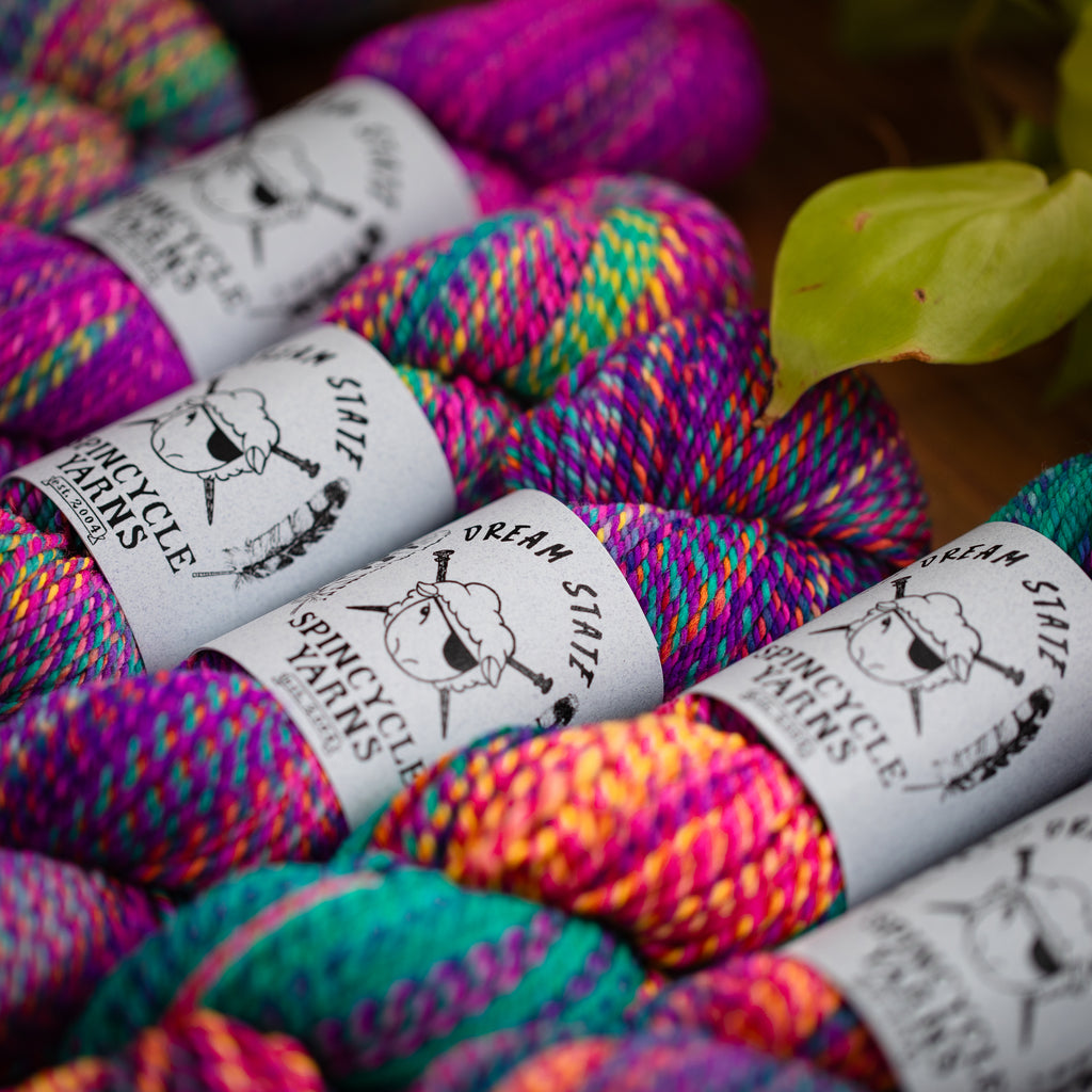 DREAM STATE • worsted weight • 100% superwashed American wool • 150 yards per skein • hand wash cold, lay flat to dry • GROWN IN THE USA • DYED & SPUN IN WASHINGTON
