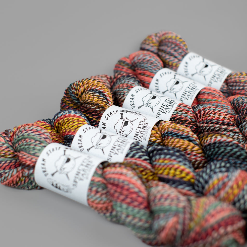 DREAM STATE • worsted weight • 100% superwashed American wool • 150 yards per skein • hand wash cold, lay flat to dry • GROWN IN THE USA • DYED & SPUN IN WASHINGTON