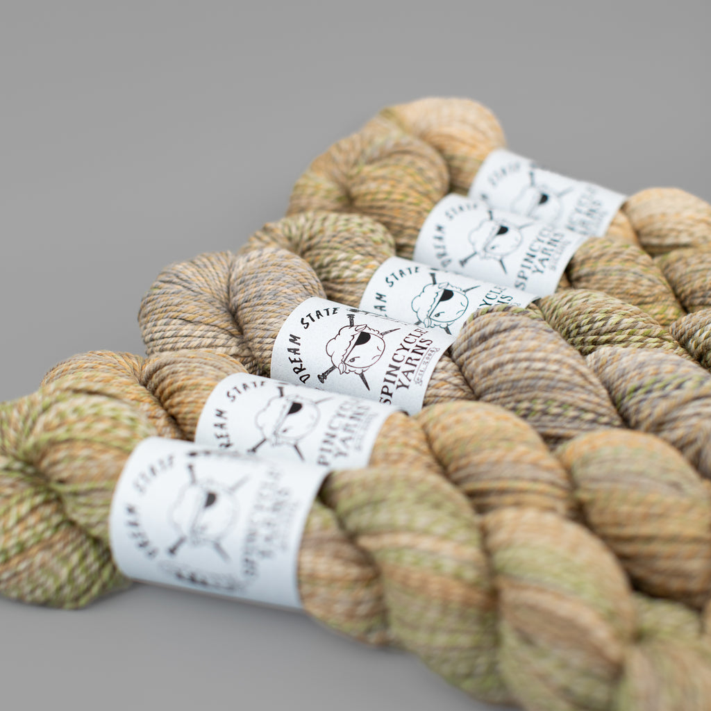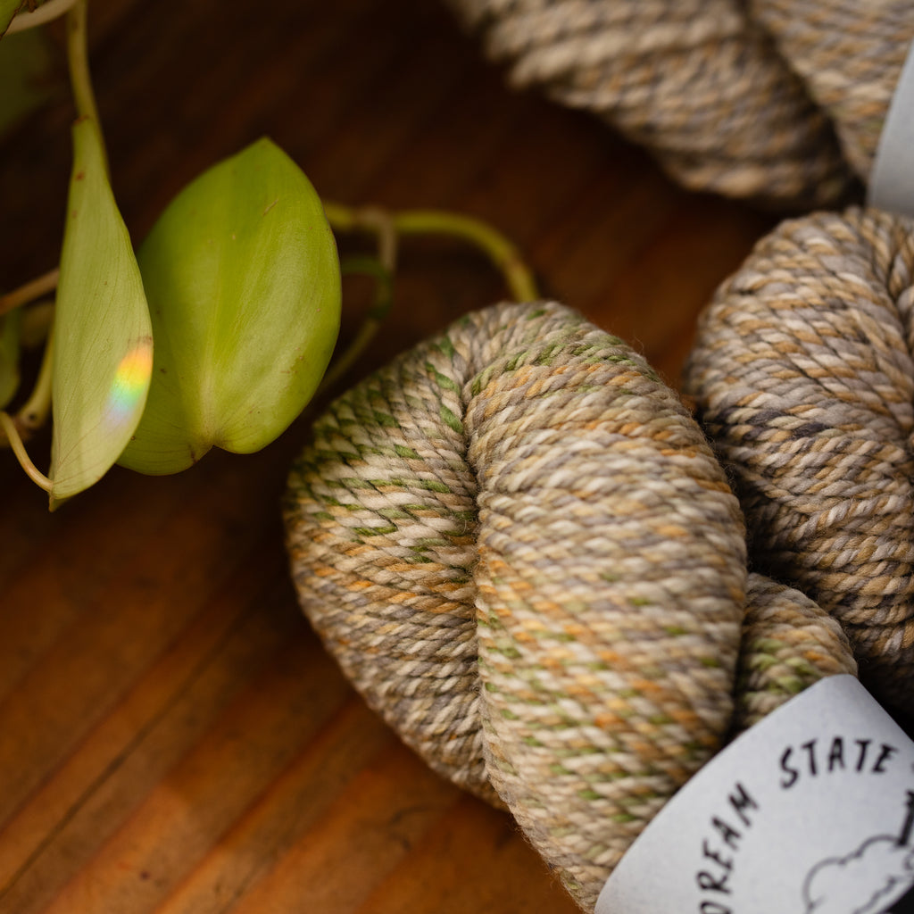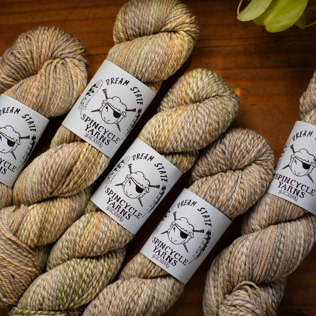 DREAM STATE • worsted weight • 100% superwashed American wool • 150 yards per skein • hand wash cold, lay flat to dry • GROWN IN THE USA • DYED & SPUN IN WASHINGTON