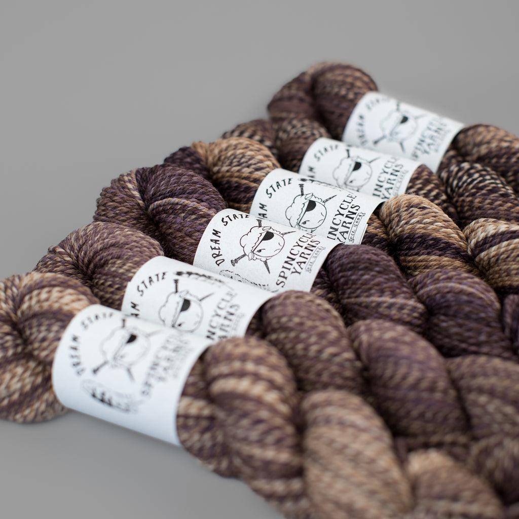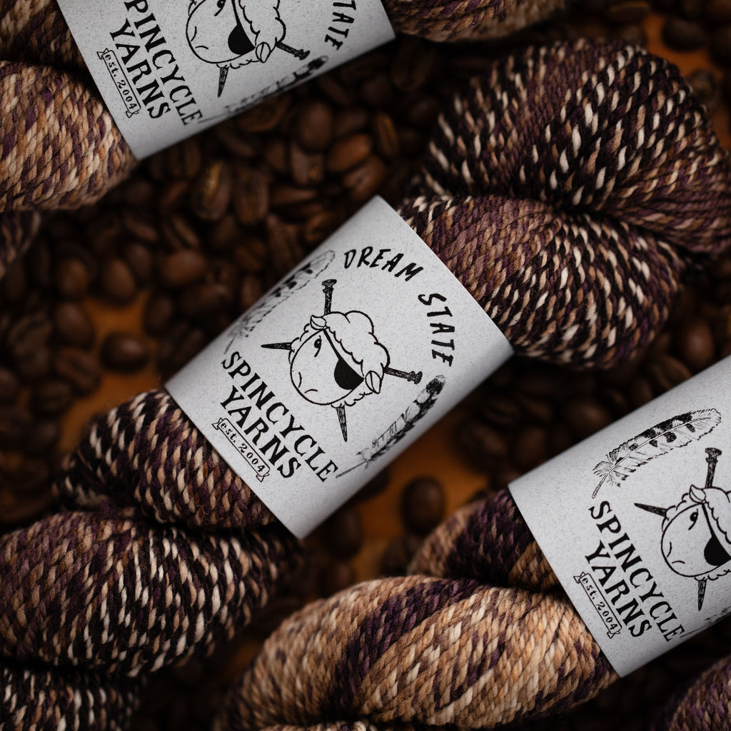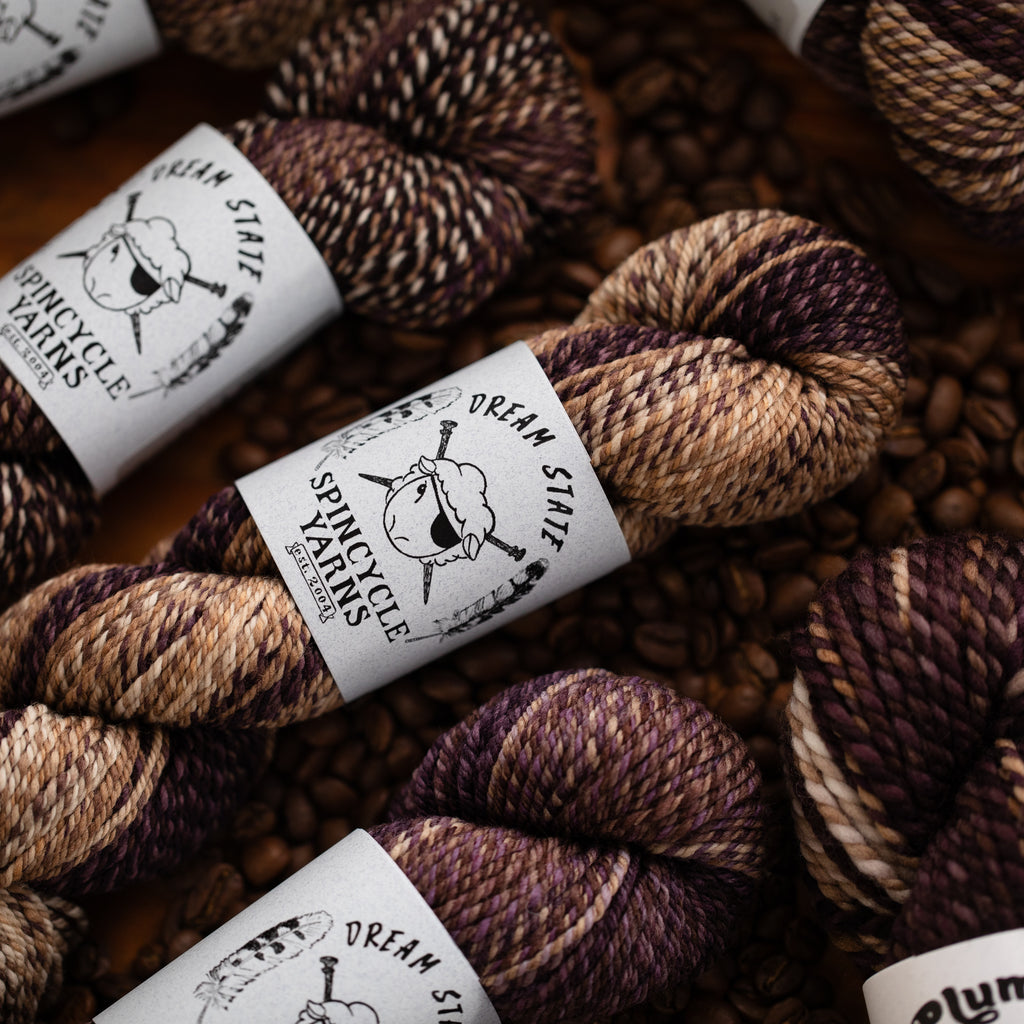 DREAM STATE • worsted weight • 100% superwashed American wool • 150 yards per skein • hand wash cold, lay flat to dry • GROWN IN THE USA • DYED & SPUN IN WASHINGTON
