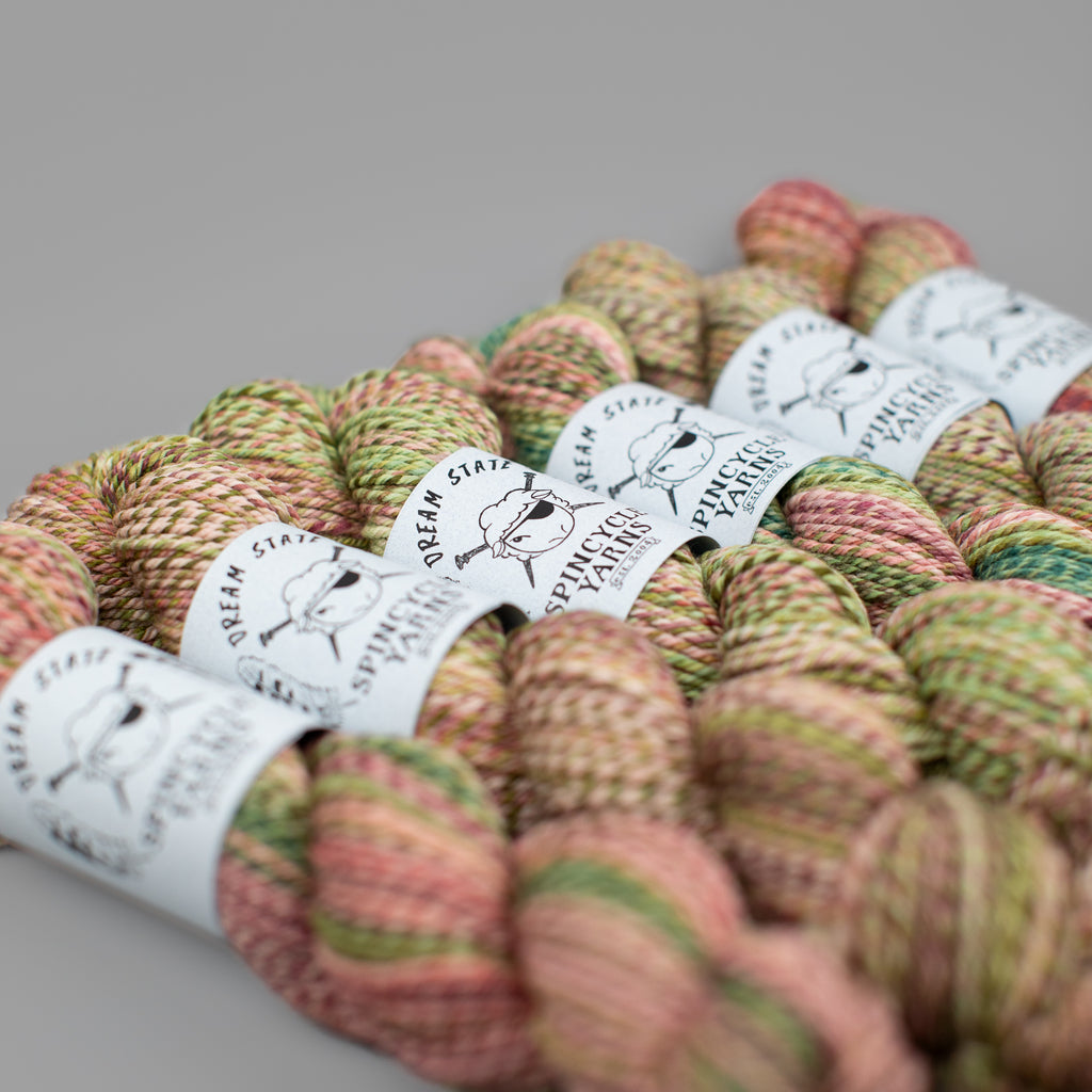 DREAM STATE • worsted weight • 100% superwashed American wool • 150 yards per skein • hand wash cold, lay flat to dry • GROWN IN THE USA • DYED & SPUN IN WASHINGTON