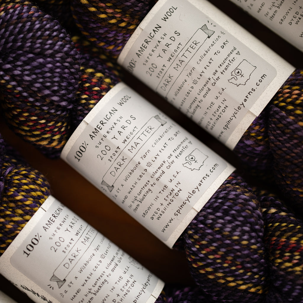 DYED IN THE WOOL • sport weight • 100% superwashed American wool • 200 yards per skein • hand wash cold, lay flat to dry • GROWN IN THE USA • DYED & SPUN IN WASHINGTON