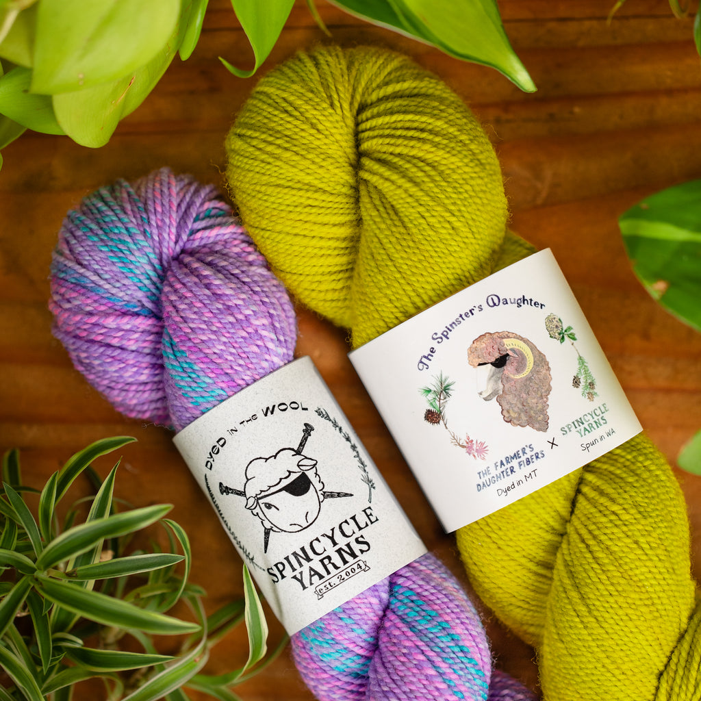 SPINSTER'S DAUGHTER SPORT • sport weight • 100% superwash American wool • 300 yards per skein • hand wash cold, lay flat to dry • MADE IN THE USA • SPUN IN WA • DYED IN MT