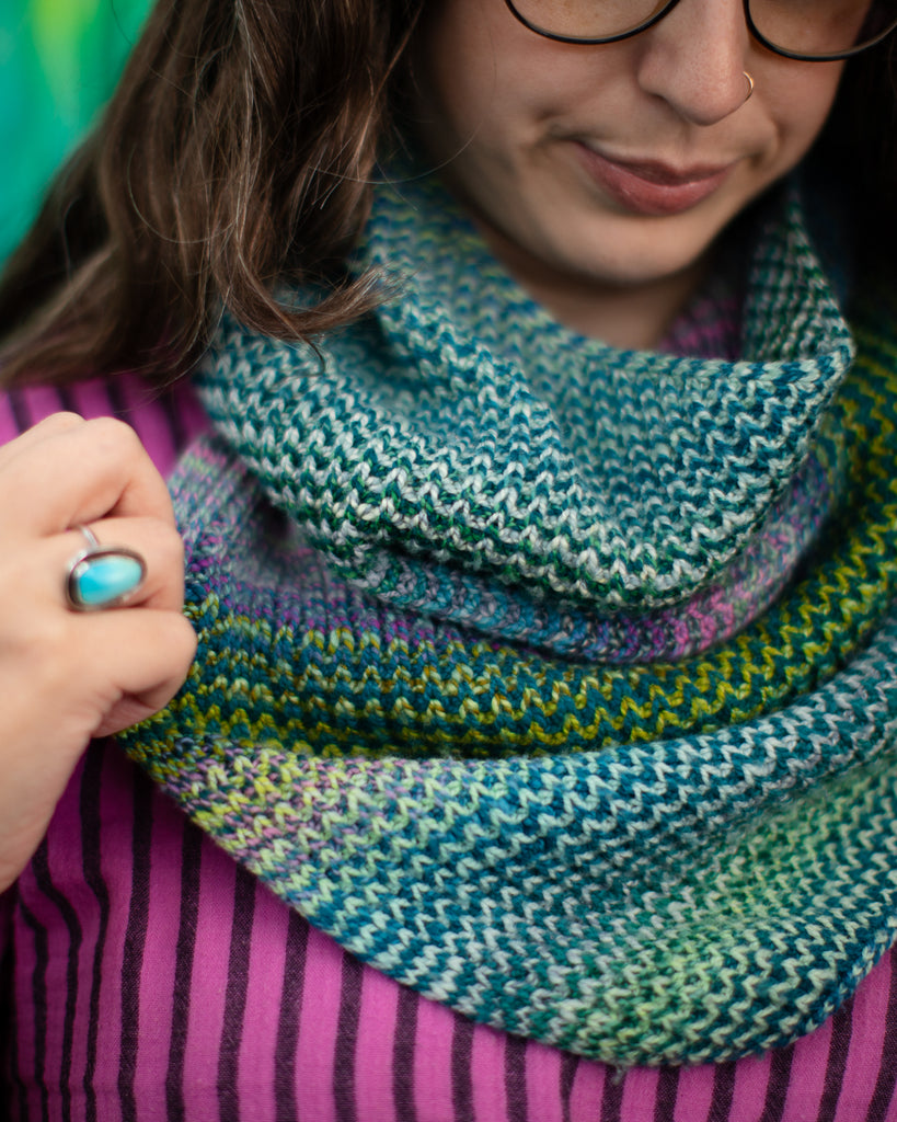 The Inclinations Cowl is based on the shape and ease of The Shift with the Half-Fisherman's Rib from the Inclinations Shawl, creating a prismatic effect that you won't be able to take your eyes off of. For your one-click convenience, this listing is for the skeins you'll need in these alternate colorways hand-picked by Anna.