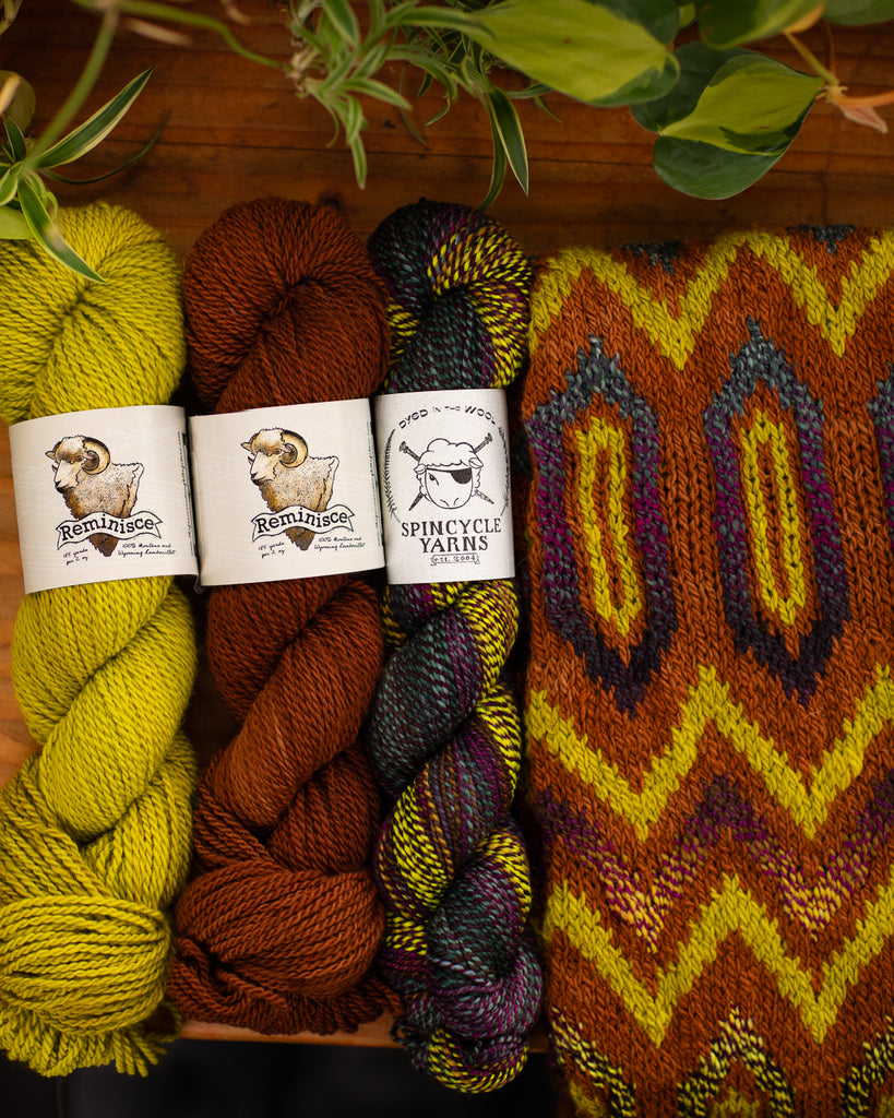 MC: The Farmer's Daughter Reminisce (100% Montana & Wyoming Ramboulliet wool) 185 yards per skein; 2 skeins in Madmartigan