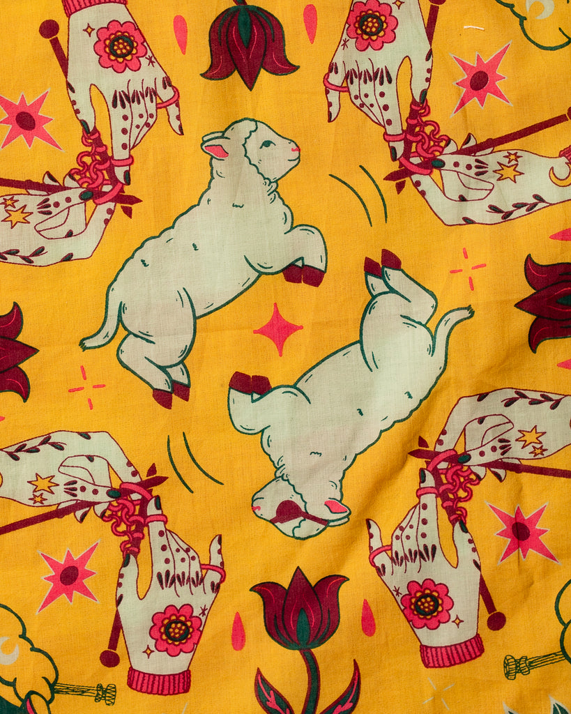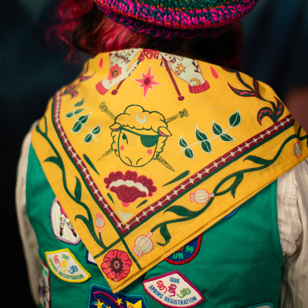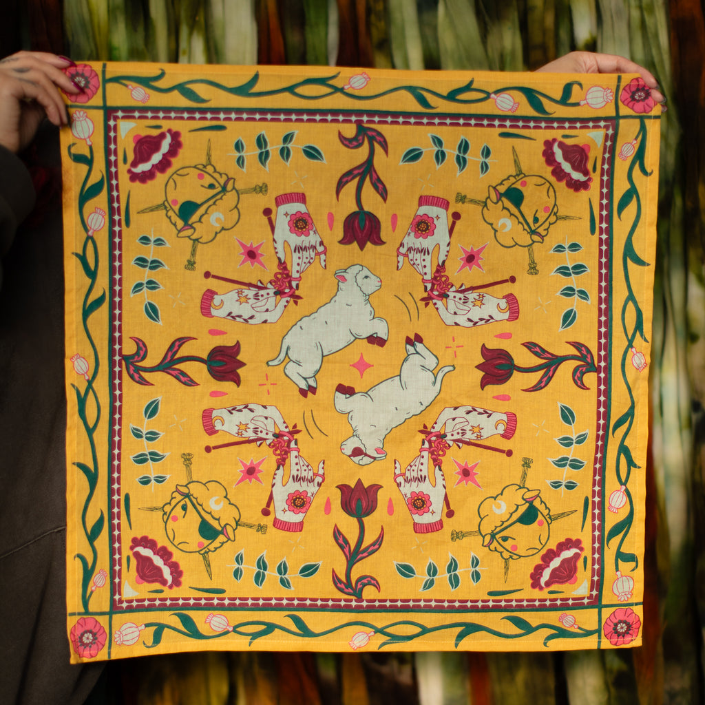 In the next installment of Spincycle merch, we give you BANDANAS! Designed by our incredibly talented in-house designer, Allynah, these bandanas are equal parts playful, practical, and campfire-cute. We couldn't love these cute little sheepies any more. These bandanas are screen-printed by hand using dyes that become part of the fabric leaving zero hand-feel, which will give you an oh-so soft bandana-wearing experience. An adorable accessory that’ll have you trail-ready in no time, these bandanas are perfect for heading out into the backcountry or popping into your LYS.