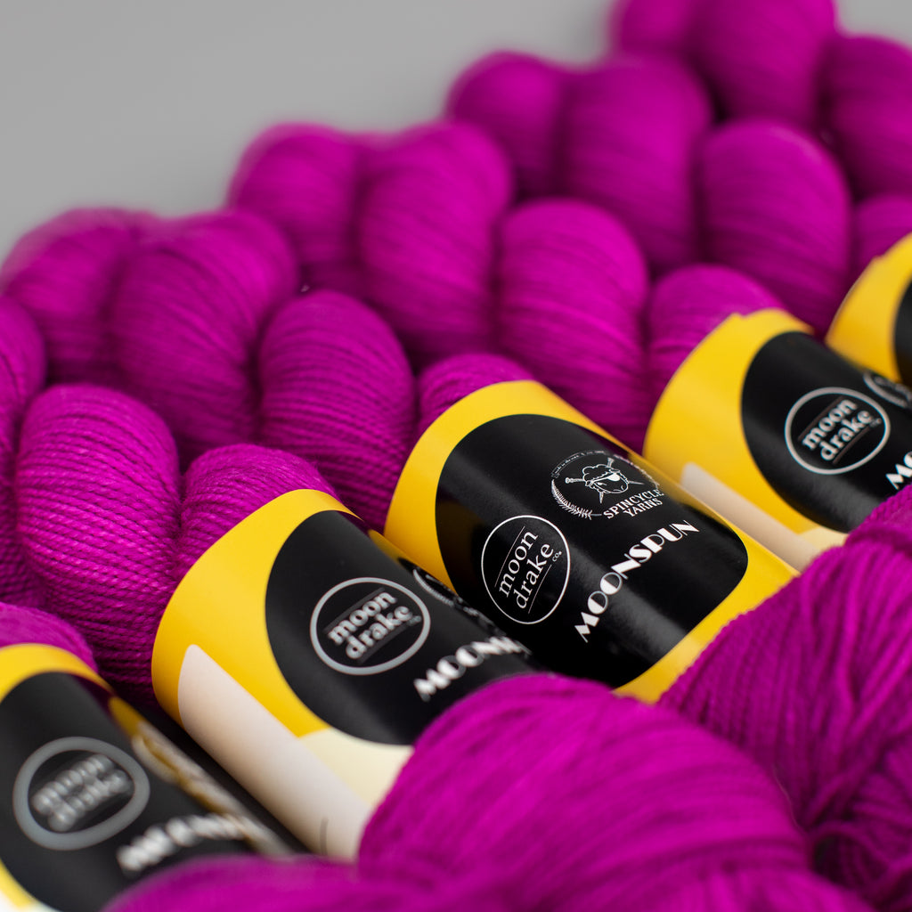MOONSPUN • sport weight • 100% superwashed American wool • 300 yards per skein • hand wash cold, lay flat to dry • MADE IN THE USA FROM SHEEP TO SKEIN