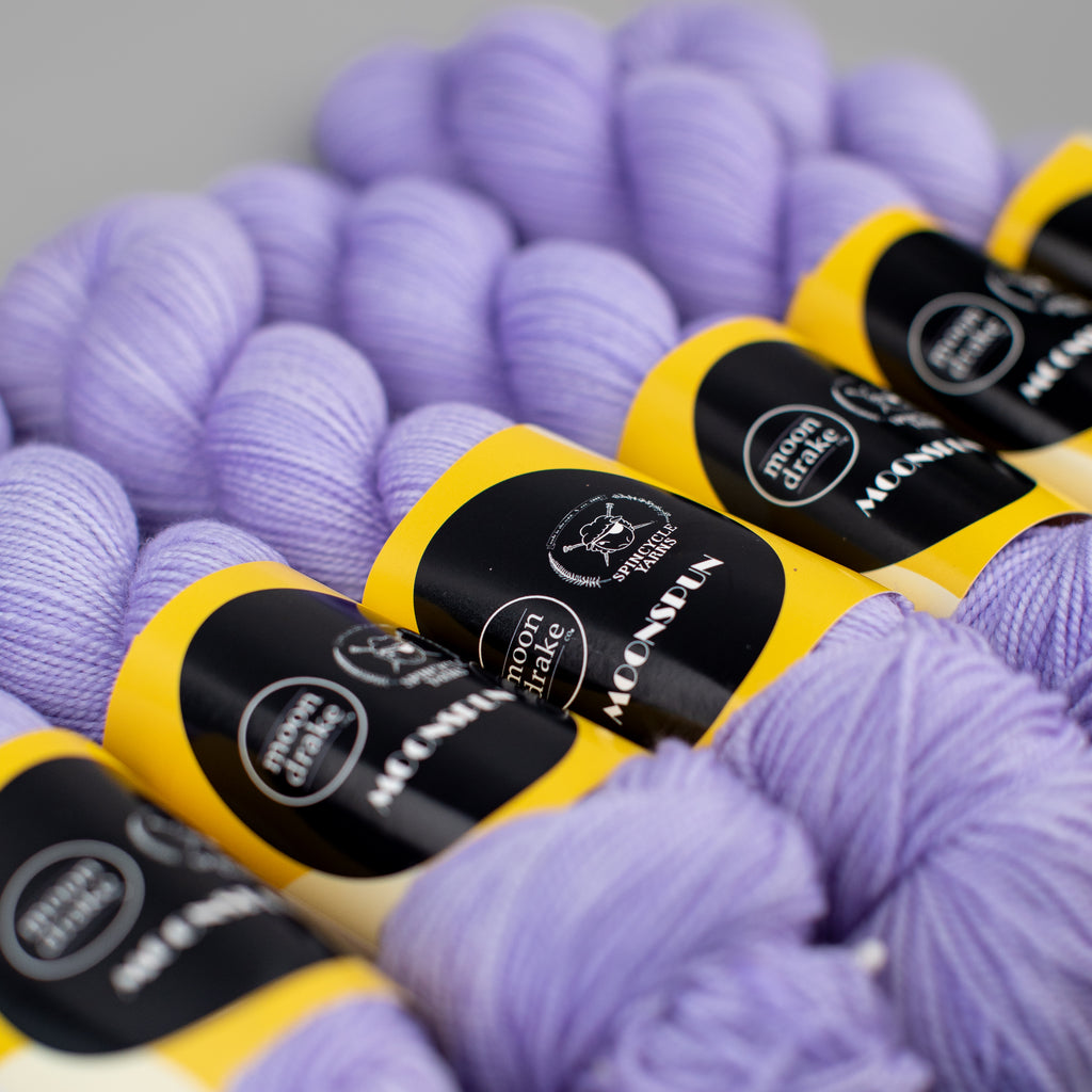 MOONSPUN • sport weight • 100% superwashed American wool • 300 yards per skein • hand wash cold, lay flat to dry • MADE IN THE USA FROM SHEEP TO SKEIN