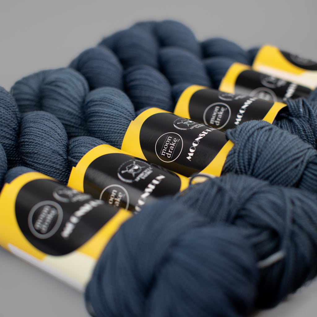 MOONSPUN • sport weight • 100% superwashed American wool • 300 yards per skein • hand wash cold, lay flat to dry • MADE IN THE USA FROM SHEEP TO SKEIN