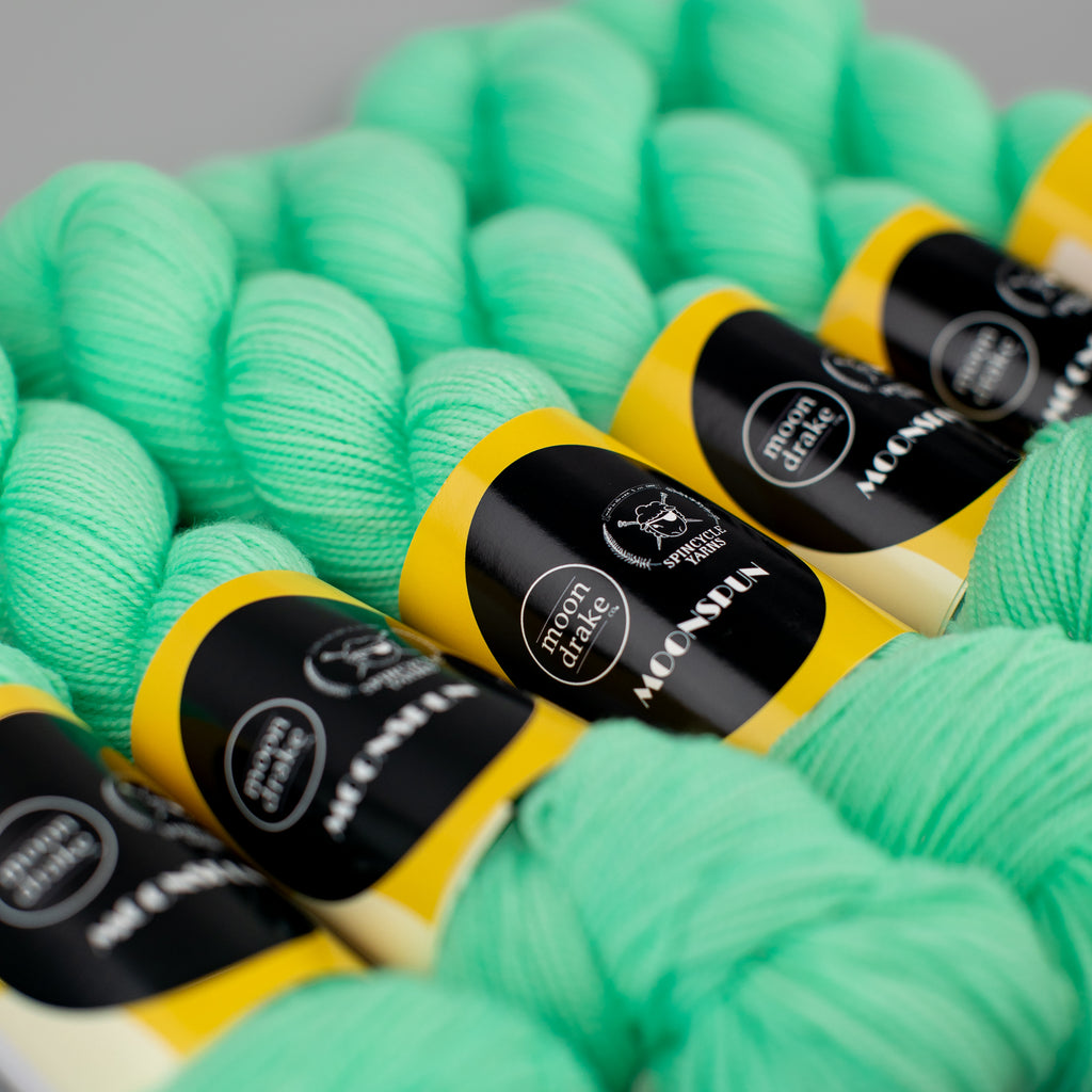 MOONSPUN • sport weight • 100% superwashed American wool • 300 yards per skein • hand wash cold, lay flat to dry • MADE IN THE USA FROM SHEEP TO SKEIN