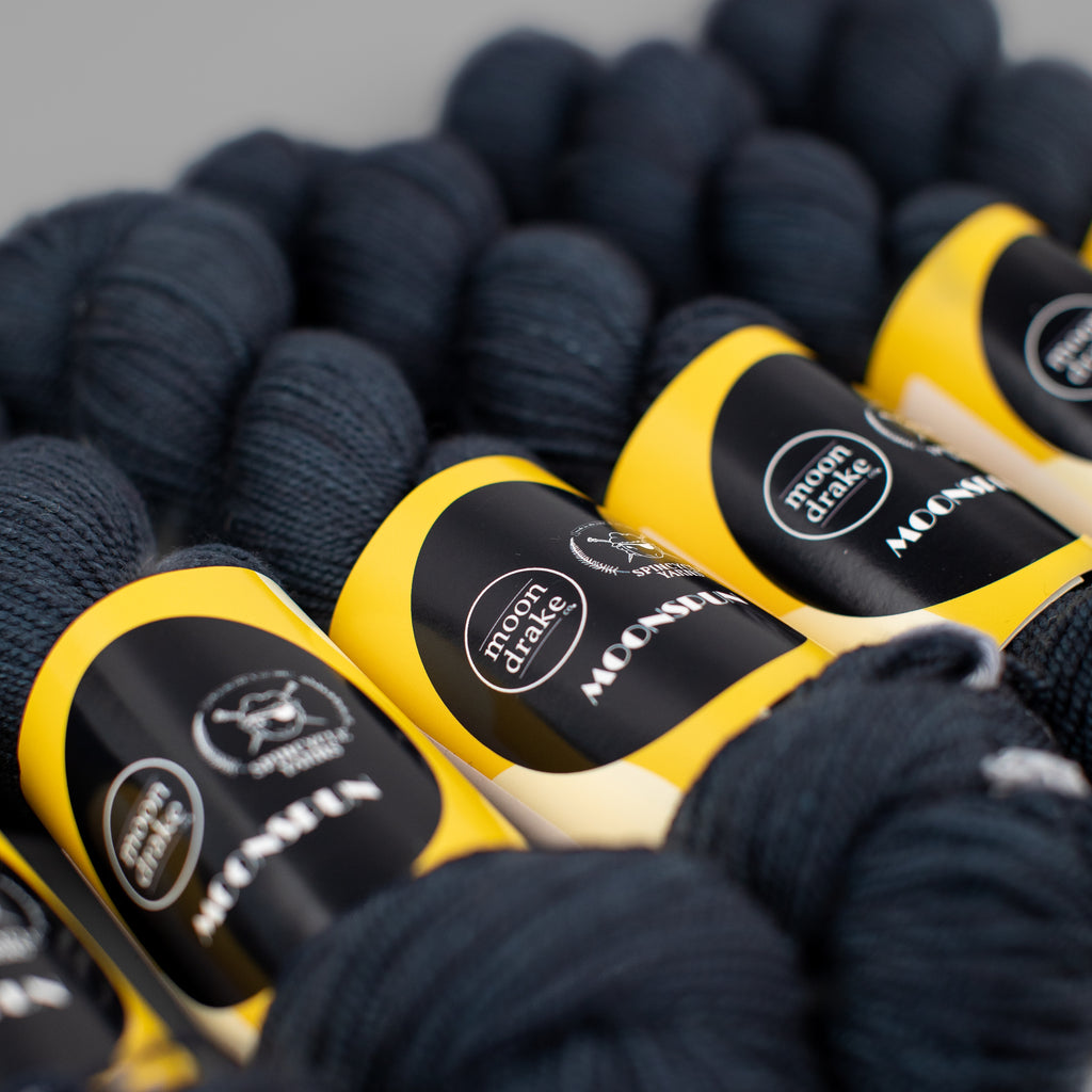 MOONSPUN • sport weight • 100% superwashed American wool • 300 yards per skein • hand wash cold, lay flat to dry • MADE IN THE USA FROM SHEEP TO SKEIN