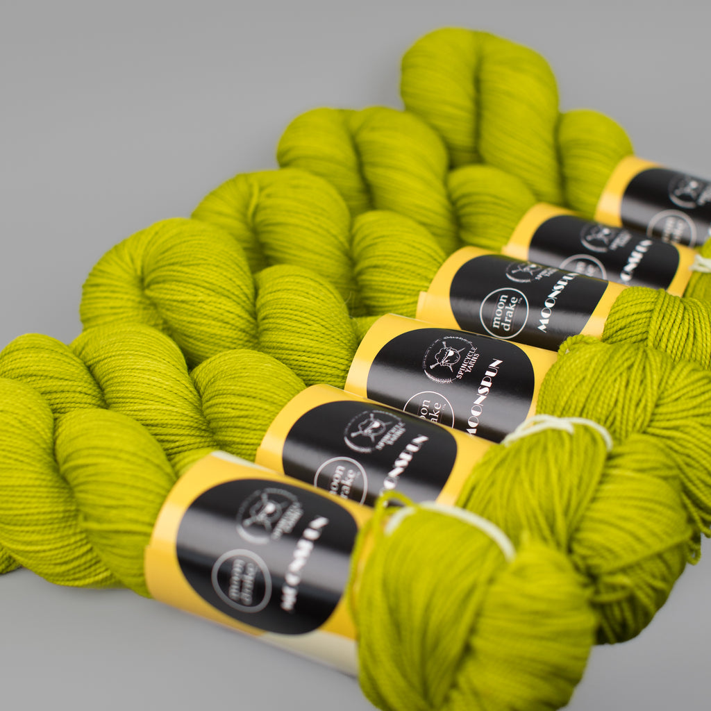 MOONSPUN • sport weight • 100% superwashed American wool • 300 yards per skein • hand wash cold, lay flat to dry • MADE IN THE USA FROM SHEEP TO SKEIN