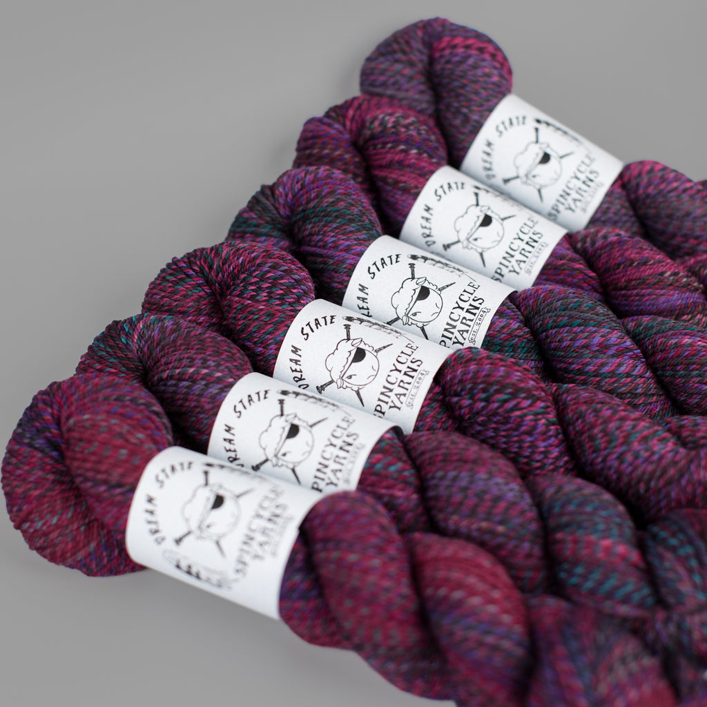 DREAM STATE • worsted weight • 100% superwashed American wool • 150 yards per skein • hand wash cold, lay flat to dry • GROWN IN THE USA • DYED & SPUN IN WASHINGTON