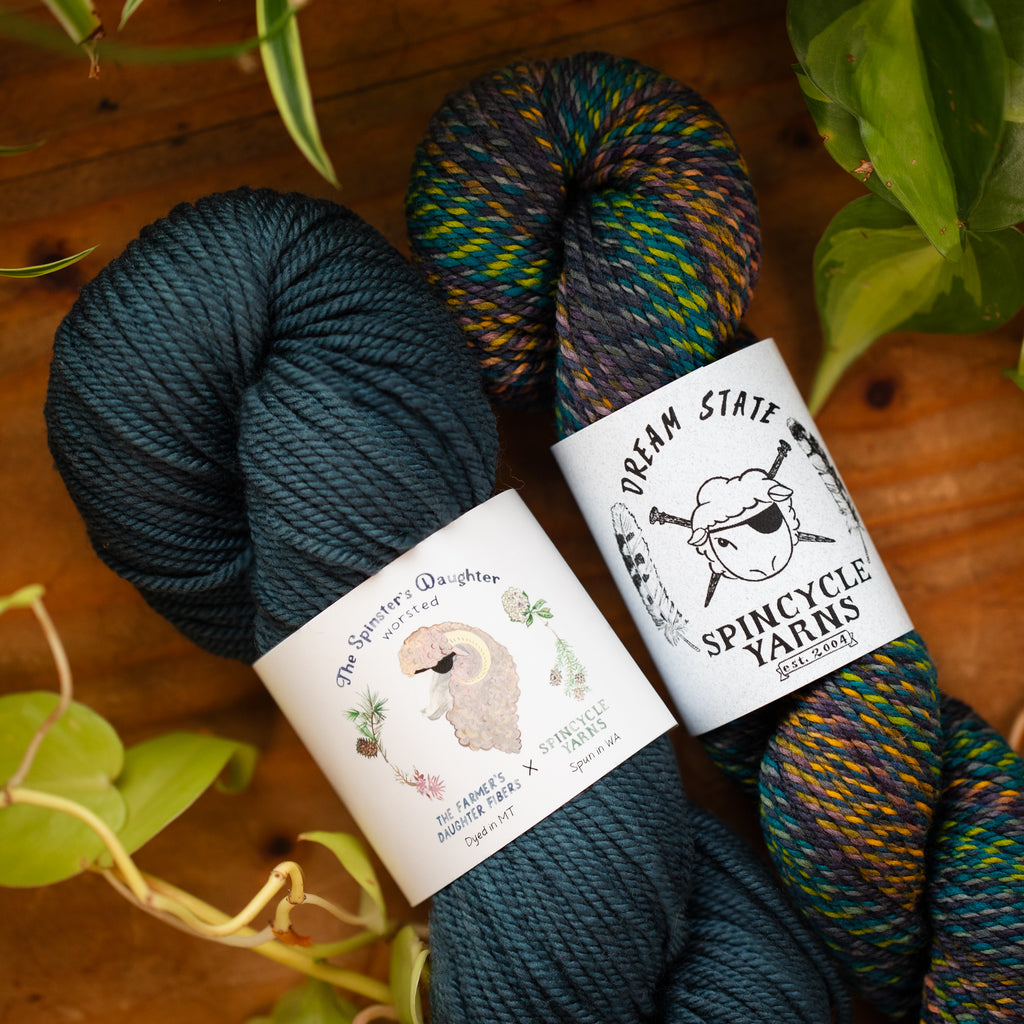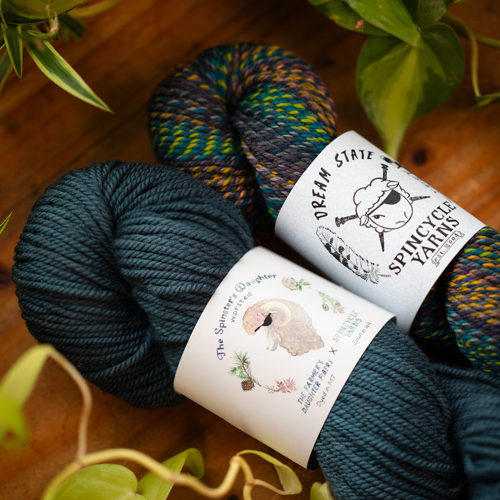 SPINSTER'S DAUGHTER WORSTED • worsted weight • 100% superwash American wool • 200 yards per skein • hand wash cold, lay flat to dry • MADE IN THE USA • SPUN IN WA • DYED IN MT