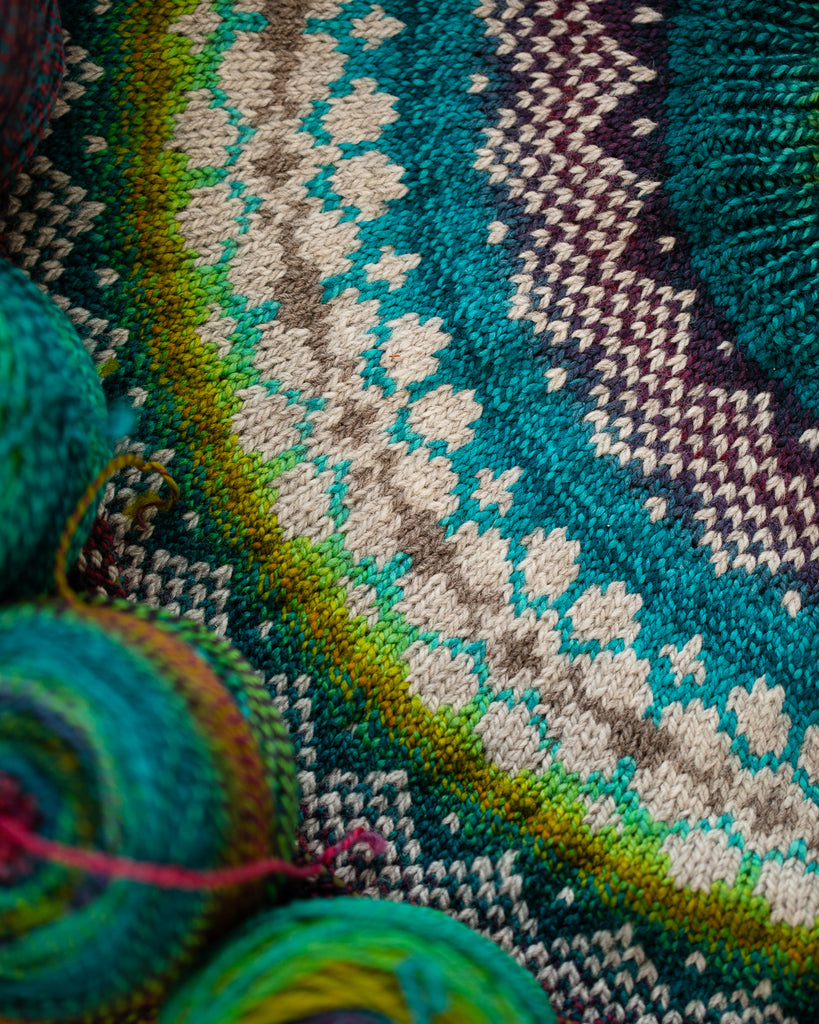 For high contrast colorwork, we recommend steam blocking to avoid color transfer. • Some dyes are notoriously difficult to set, and may exhaust some color even after our final wash. • Please keep this in mind if you are combining any hand dyed yarn with a light color in the same project. • If you plan to combine a hand dyed yarn, especially a very saturated colorway, with a lighter yarn, we suggest you test your darker skeins for possible color transfer by soaking them first. • To wash your knitwear, a quick cold water dip with a no-rinse wool wash is recommended.