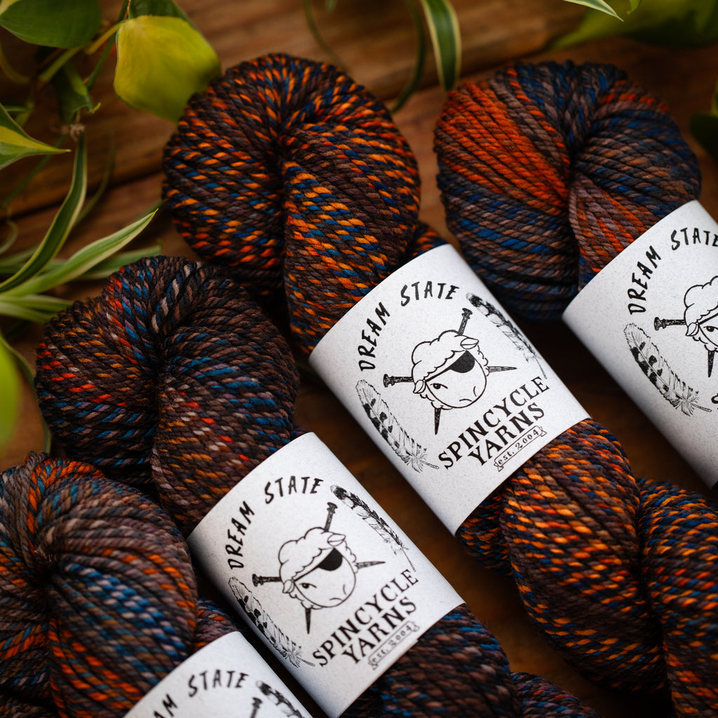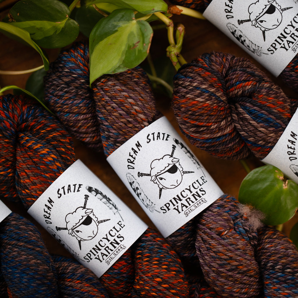 DREAM STATE • worsted weight • 100% superwashed American wool • 150 yards per skein • hand wash cold, lay flat to dry • GROWN IN THE USA • DYED & SPUN IN WASHINGTON