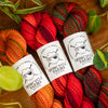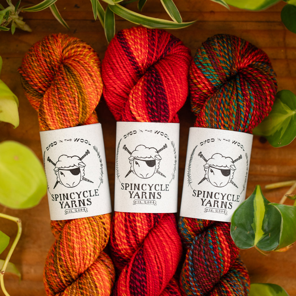 Dyed in The Wool (100% American wool) 200 yards per skein; 1 skein each in Vellichor, Devilish Grin and Rusted Rainbow